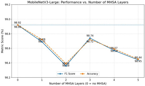 Figure 8 illustrates the variation in performance as the number of MHSA layers increases from 0 (no MHSA) to 5. The baseline configuration without MHSA achieved the best results (Accuracy and F1 = 98.92%), while adding attention layers led to small, non-monotonic changes. Performance slightly decreased with two layers, recovered marginally at three, and declined again thereafter. Overall, additional attention depth produced negligible improvement, confirming that a single global representation extracted by the backbone already captures the most discriminative information needed for this task.