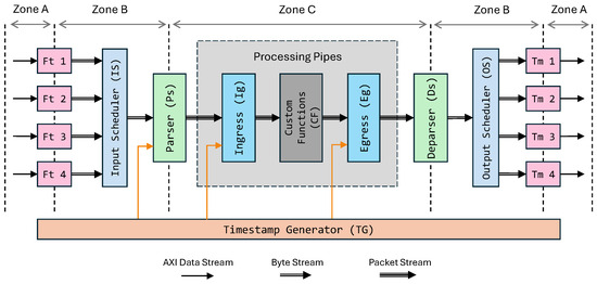Once merged, the byte stream is processed by the parser (Ps). The parser reconstructs the packet headers according to the flattened parse graph extracted from the JSON output of the P4 compiler. Upon successful parsing, the relevant metadata fields are assigned and attached to the packet. Among the metadata, timestamps form a critical group. To generate these timestamps, a free-running counter is implemented and shared between the parser, ingress, and egress stages. This counter ensures synchronized timing information without introducing dependencies that might stall the pipeline. Parsed packets are then buffered in a packet FIFO before entering the ingress block. Match–action processing is carried out within the ingress block. The processed packets are subsequently forwarded to the next pipeline stage.