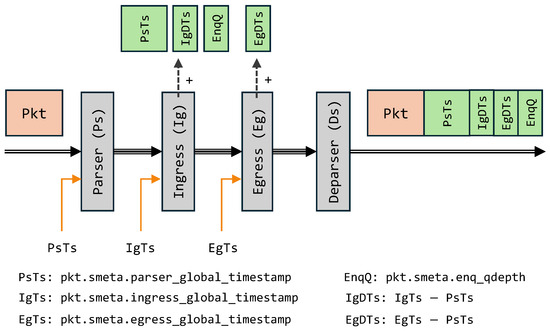 Although previous studies such as FAST [50] and P4→NetFPGA [51] investigated built-in metadata in programmable pipelines, the proposed solution advances the concept by introducing multiple timestamp elements and defining metadata compatible with the V1Model architecture. This compatibility enhances portability, allowing P4 programs to be reused across different architectures with minimal changes. Additionally, the integration of stateful objects with built-in metadata enables practical applications such as flow control within an automated P4-to-HLS design flow.