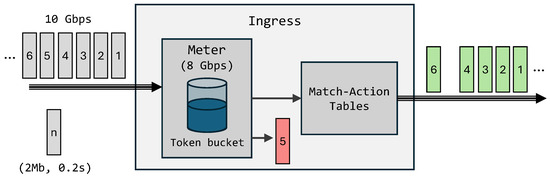 Building on these standards, recent work has proposed adaptive and predictive token-bucket variants. The dynamic priority token bucket tolerates temporary violations by lowering application priority rather than immediately falling back to best-effort service, thereby improving robustness against bursty traffic [30]. The prediction-based fair token bucket coordinates distributed rate limiters, improving fairness and bandwidth utilization in cloud environments [31]. In addition, TCP-friendly meters have been implemented in P4 data planes, addressing the limitations of commercial switch meters and significantly improving TCP performance [32].