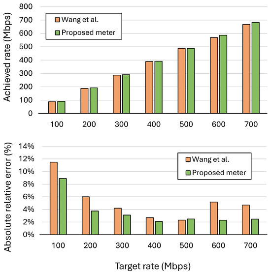 Figure 7 compares the metering accuracy of the proposed design with the method presented by Wang et al. [32] in target rates ranging from 100 to 700 Mbps. The comparison rate was limited to 700 Mb/s to align with the results reported in [32], as no higher-rate data were available from that study. Nevertheless, the proposed pipeline can sustain higher traffic rates, and no clear saturation or limiting throughput was observed in the experiments, indicating that the meters and processing stages remain fully functional beyond the tested rate. The proposed meter consistently achieves lower absolute relative error rates, demonstrating greater precision in rate regulation. At lower target rates such as 100 and 200 Mbps, the error is reduced from approximately 11.5% to 8.9% and from 6% to 3.75%, respectively. This improvement remains consistent with higher rates, where the error steadily decreases and remains below 3% for most cases. These results confirm that the proposed meter offers more stable and accurate rate enforcement across the entire range of target traffic rates.