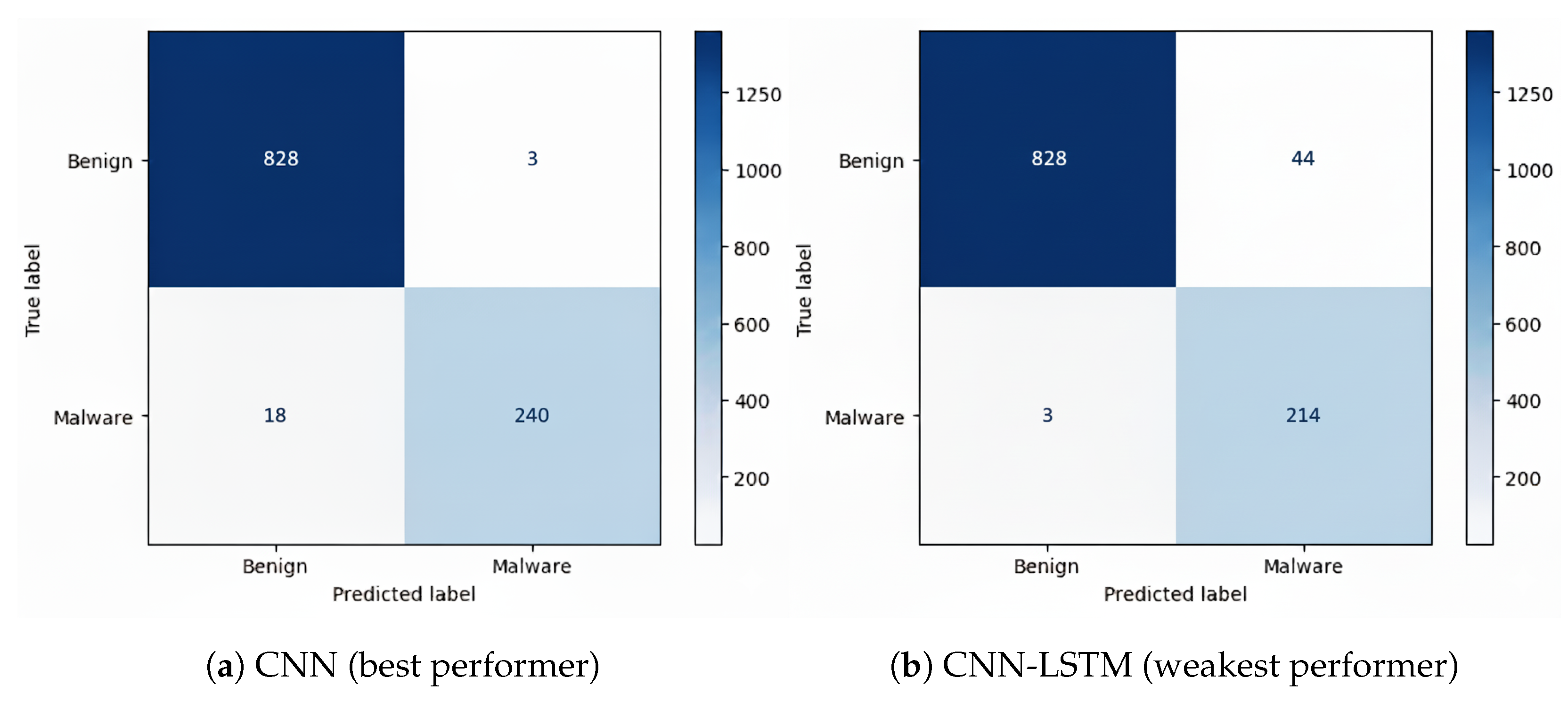- CNN-LSTM: Balanced accuracy (94.2%) and inference time (68 ms), representing a suitable trade-off between speed and reliability.