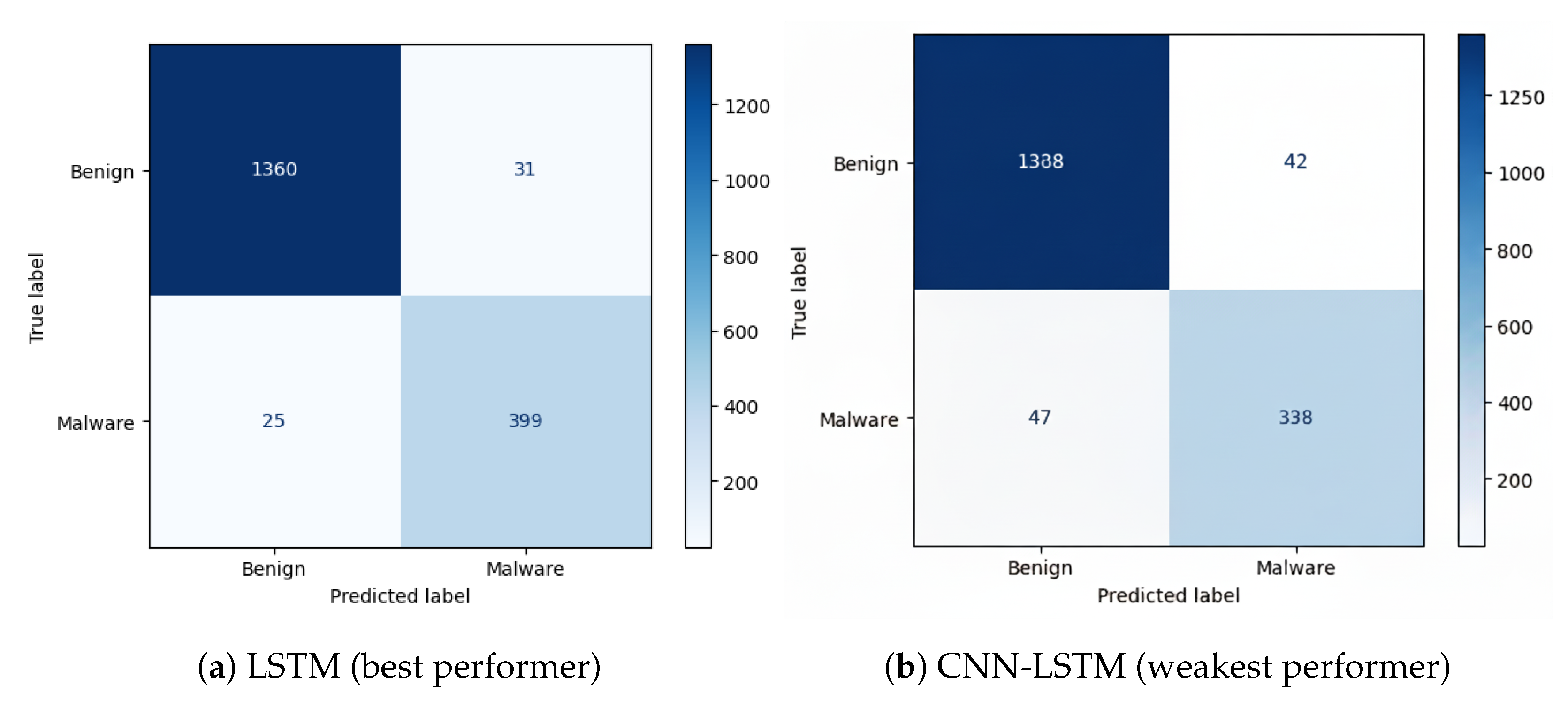 - LSTM minimized FN (32), but at the cost of higher FP (505).