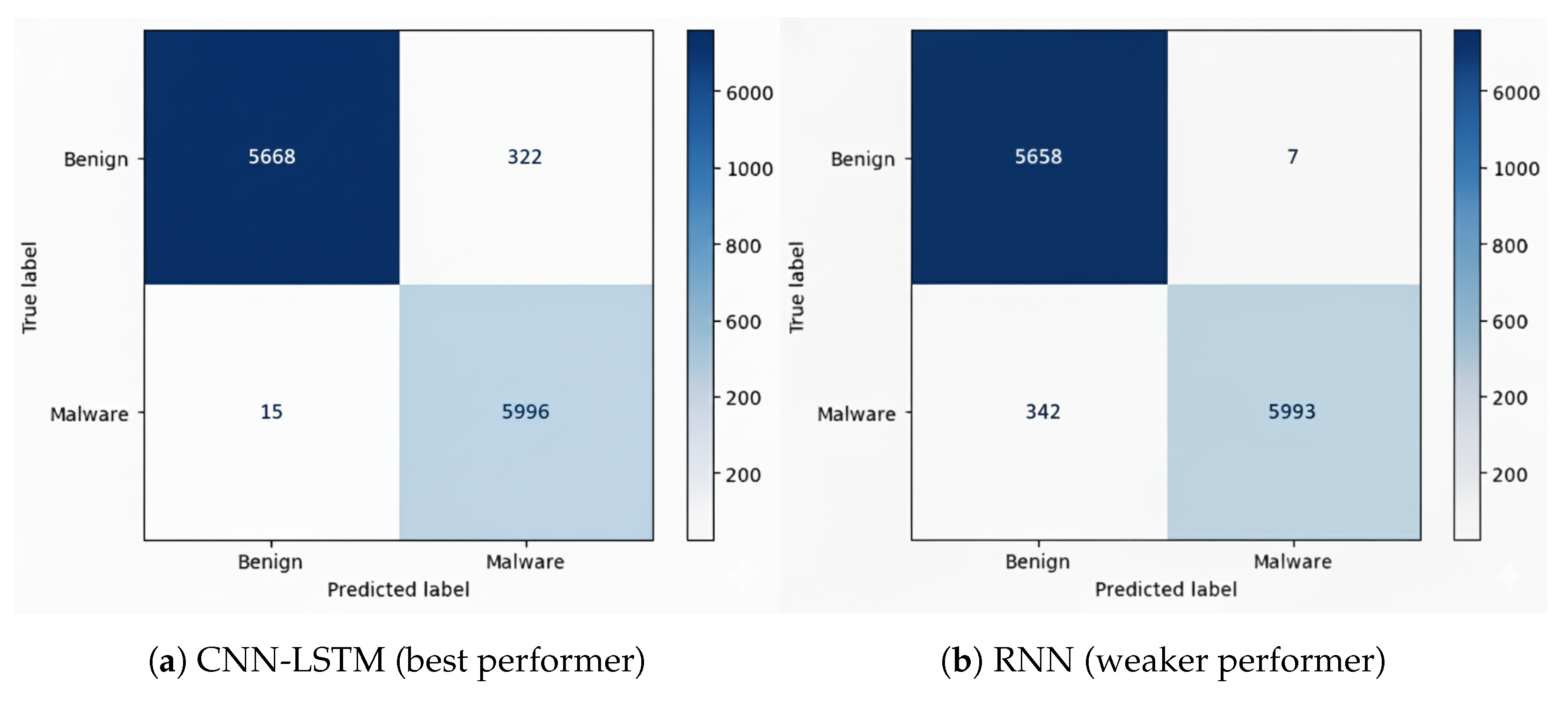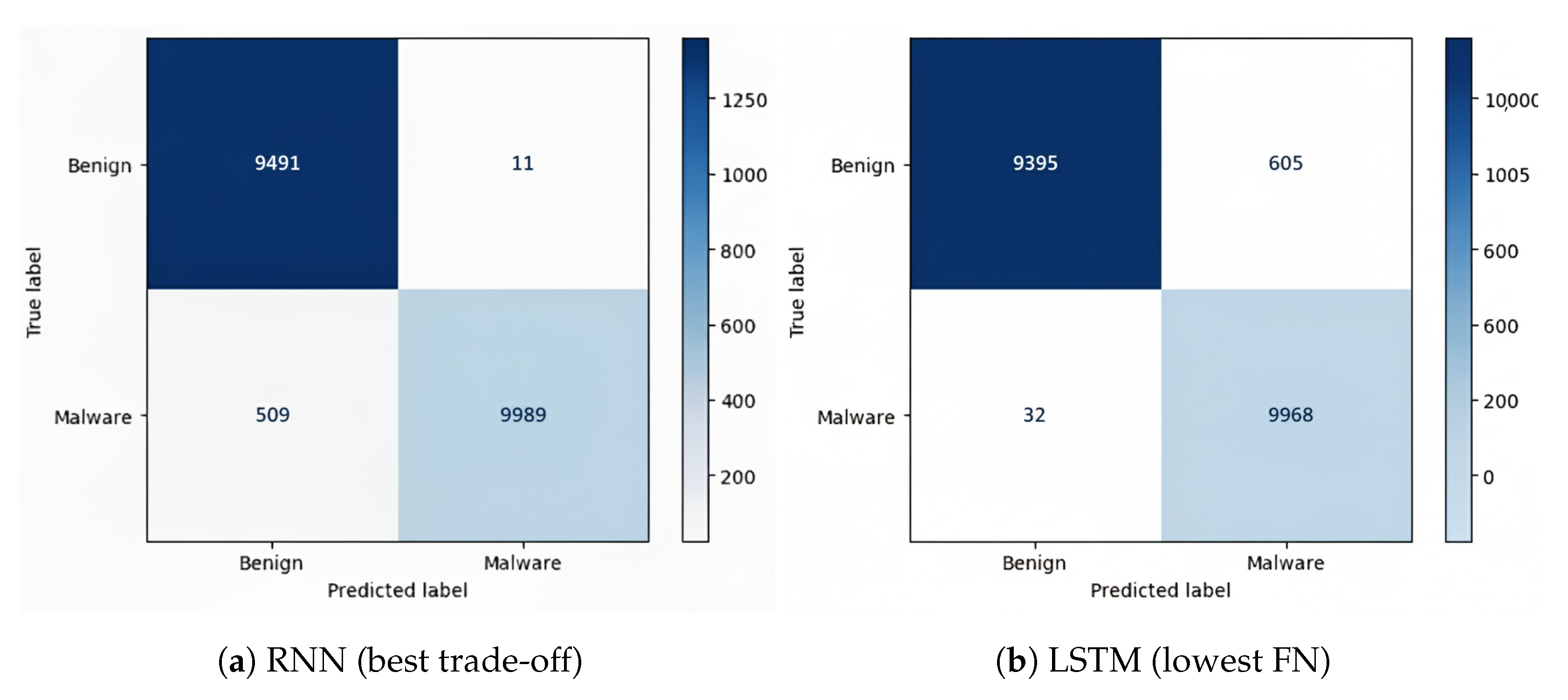 - RNN achieved the best overall balance, with the lowest FP (11) and relatively low FN (509).