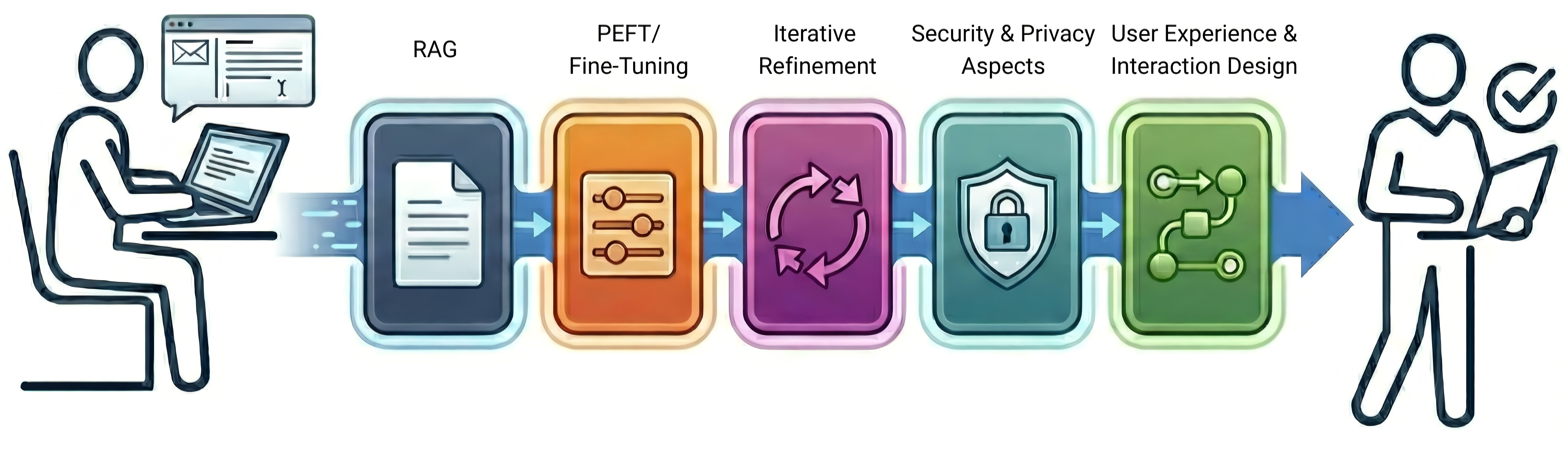 In response to RQ1 (What are the core strategies and frameworks that enable the effective generation of personalized email responses using LLMs?), this review concludes that effective personalization in email generation cannot be achieved through a single technology, but rather through a multifaceted approach that combines three core technical strategies: RAG, PEFT and Iterative Refinement. RAG is a key strategy for providing LLMs with up-to-date external context, such as a user’s past correspondence, without costly retraining. This approach is central to frameworks like PersonaAI, which uses semantic retrieval for dynamic personalization, and Panza, which leverages RAG within a privacy-preserving, locally run architecture. PEFT, in turn, addresses the challenge of adapting massive models to individual users in a scalable manner. Techniques like Low-Rank Adaptation (LoRA) enable the fine-tuning of an LLM to a user’s specific writing style by training only a small fraction of the model’s parameters, making personalization feasible on commodity hardware with limited data. Panza successfully employs this method and is foundational to the alignment process in DITTO, which updates a model based on user demonstrations. The field is also advancing toward more dynamic systems through iterative, feedback-driven learning. Frameworks such as SELF-REFINE enable an LLM to provide self-feedback, thereby improving its output. Meanwhile, dedicated critic models like Shepherd and implicit learning systems like PIT further enhance this capability. Alongside these core techniques, the most effective systems recognize the importance of user-centric design, innovating on the user-AI interaction with structured interfaces for creative exploration (Luminate), cognitive load reduction through guided Q&A (ResQ), and novel interfaces for managing multiple writing variations (ABScribe).