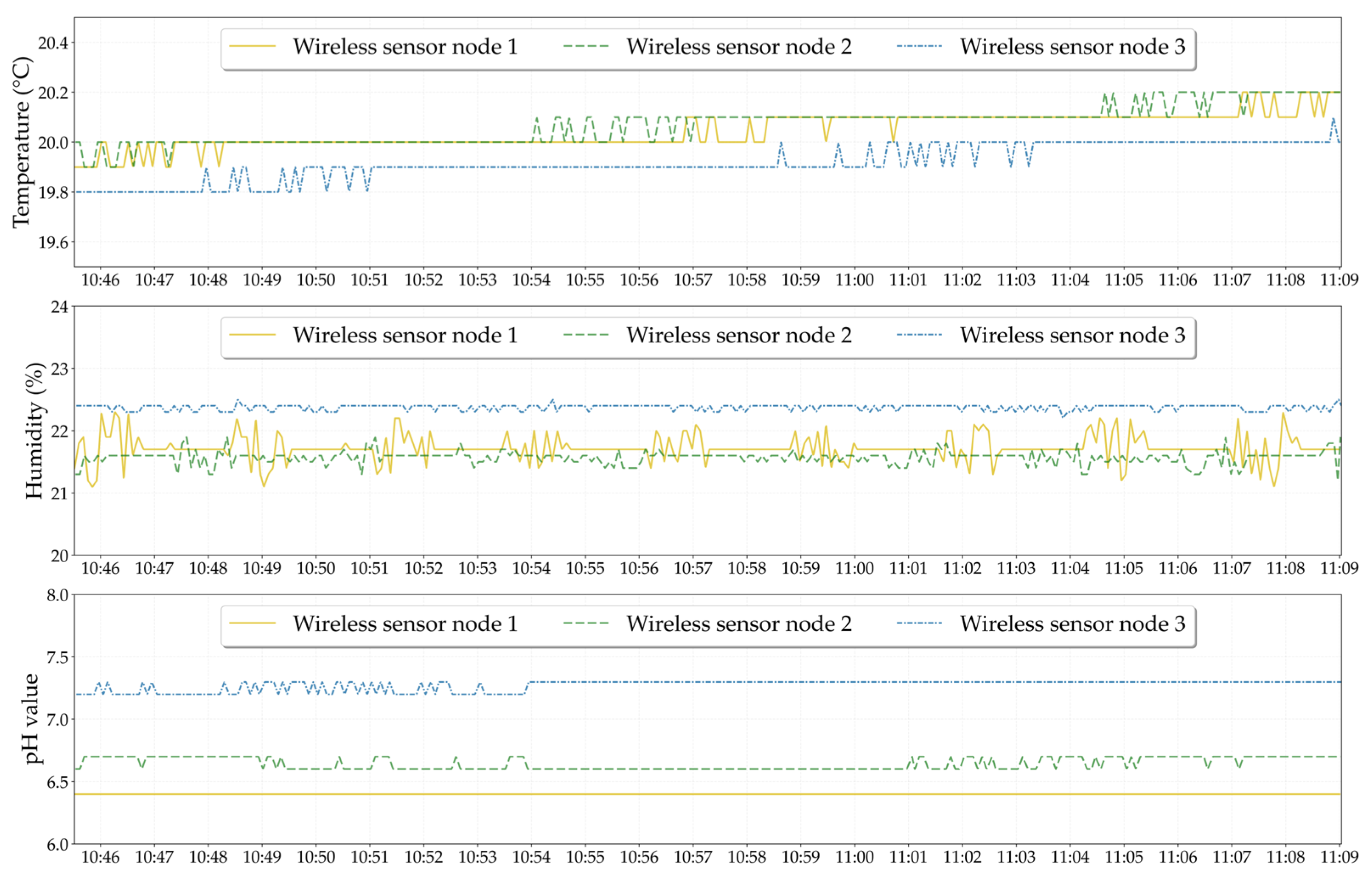 | [15,16] | The works use the Arduino-based sensor nodes to acquire agricultural information including soil moisture and send data to a cloud server via Wi-Fi. | Soil pH is not monitored [15] and the method [16] is only evaluated in a short period of time. |