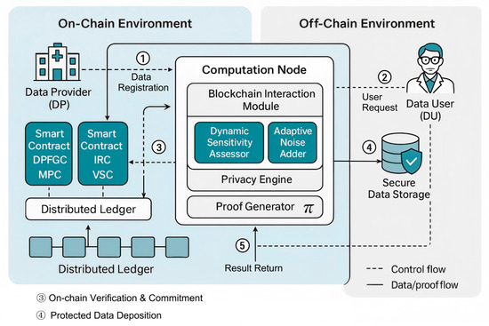 - Threat Model and Trust Boundaries: All participants are considered honest-but-curious and cannot access raw medical data in plaintext. Blockchain nodes can record and verify statistics processed under differential privacy as well as zero-knowledge proofs. Differential privacy mechanisms provide individual-level anonymity, while homomorphic encryption ensures that intermediate values on-chain remain confidential.