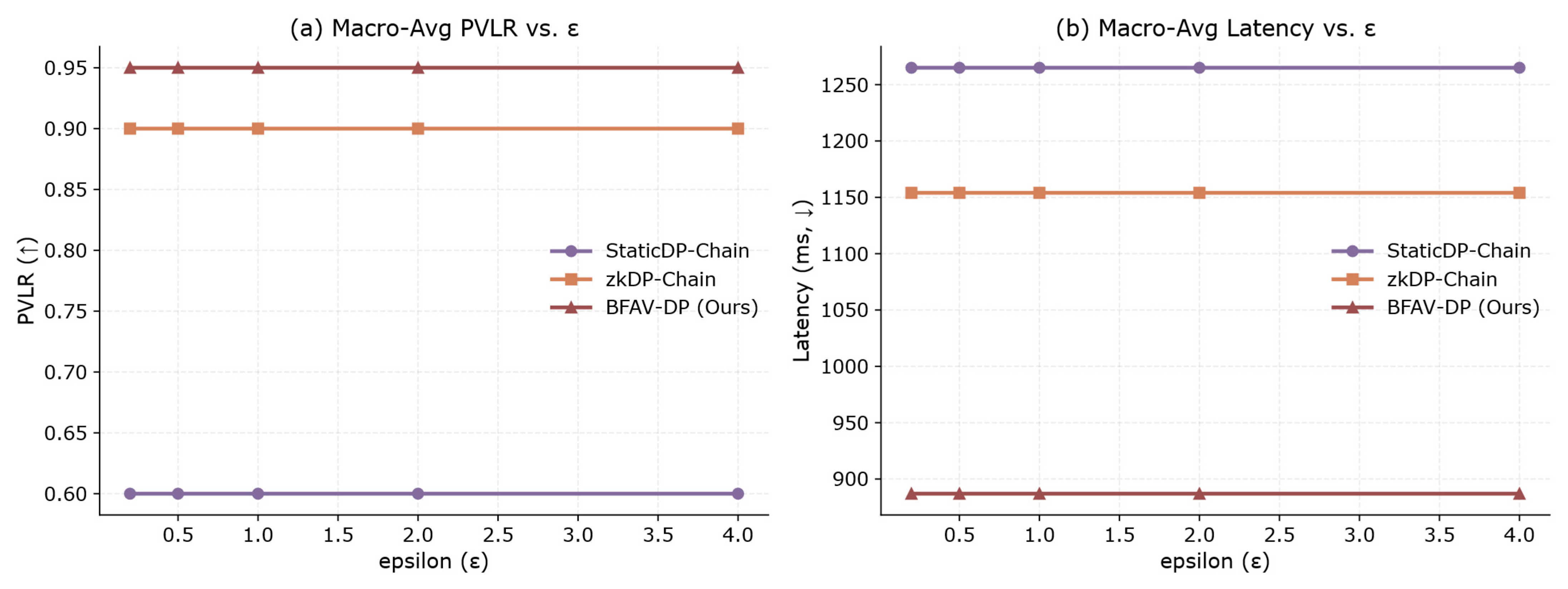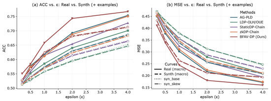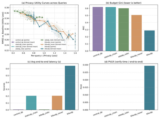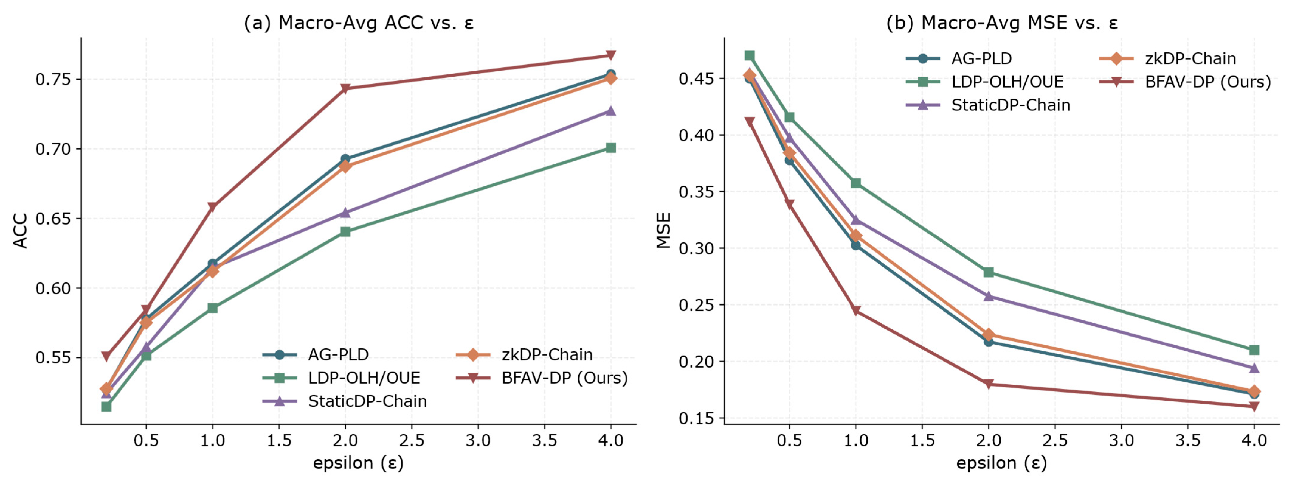 - BFAV-DP (proposed method): The method proposed in this work, combining fair budget allocation and verifiable on-chain storage. It integrates data partition perturbation, multi-round averaging, homomorphic encryption, and blockchain collaboration, ensuring privacy protection while also achieving fairness, verifiability, and high data utility.