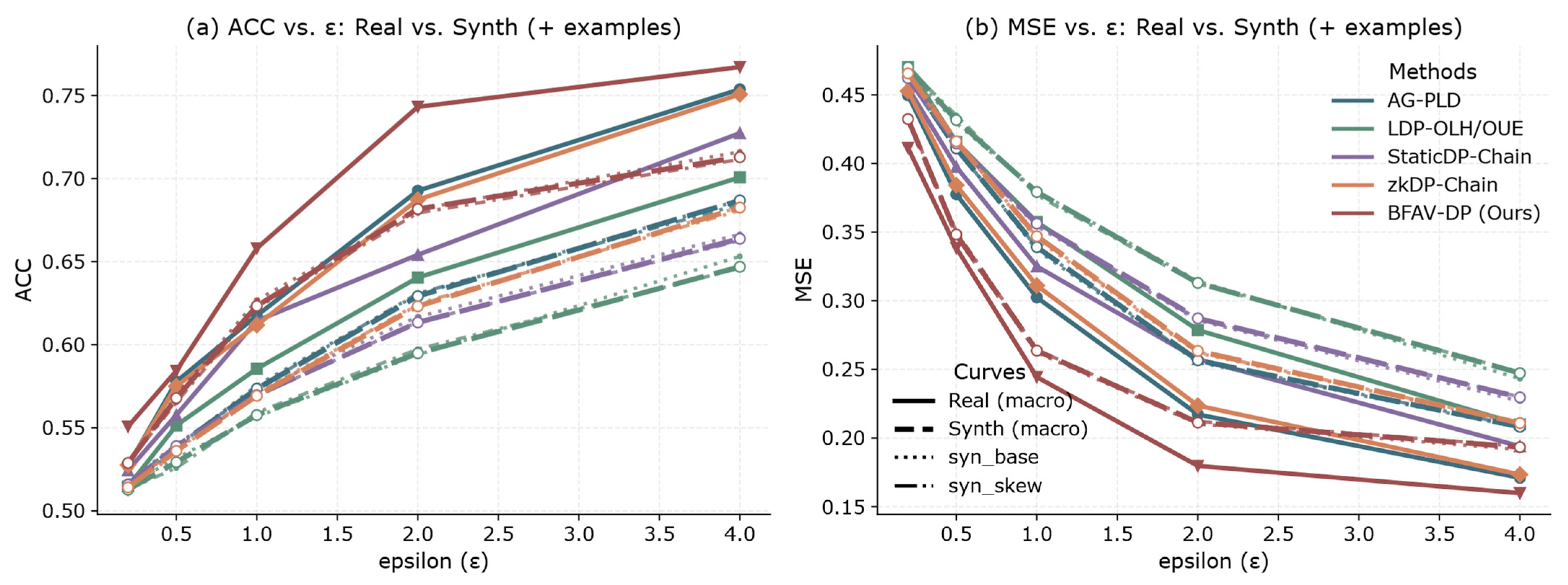 - Application Level and Statistical Consistency Goals: BFAV-DP targets aggregate-level medical analyses (e.g., risk assessment, cohort studies). It does not require per-sample consistency for individual predictions but emphasizes maintaining statistical trend consistency under noise addition [44]. That is, metrics such as ACC and MSE should follow stable patterns with varying and preserve relative ordering across different models.