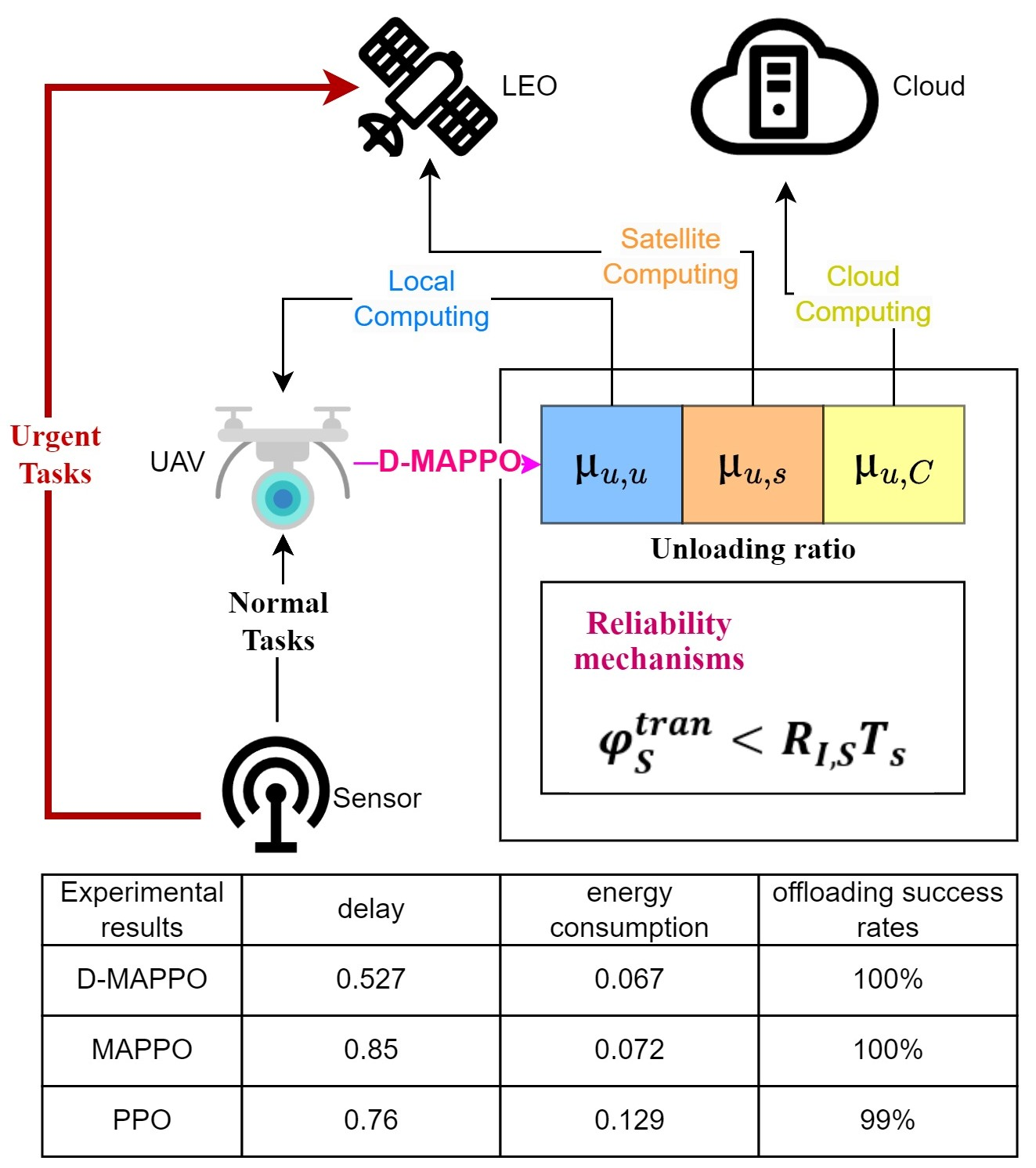 - To address the limited satellite coverage time and improve communication quality, a reliability mechanism for task offloading from ground sensors and UAVs to satellites is proposed. In addition, the communication process, satellite coverage duration, and overall network cost are modeled within the proposed framework.