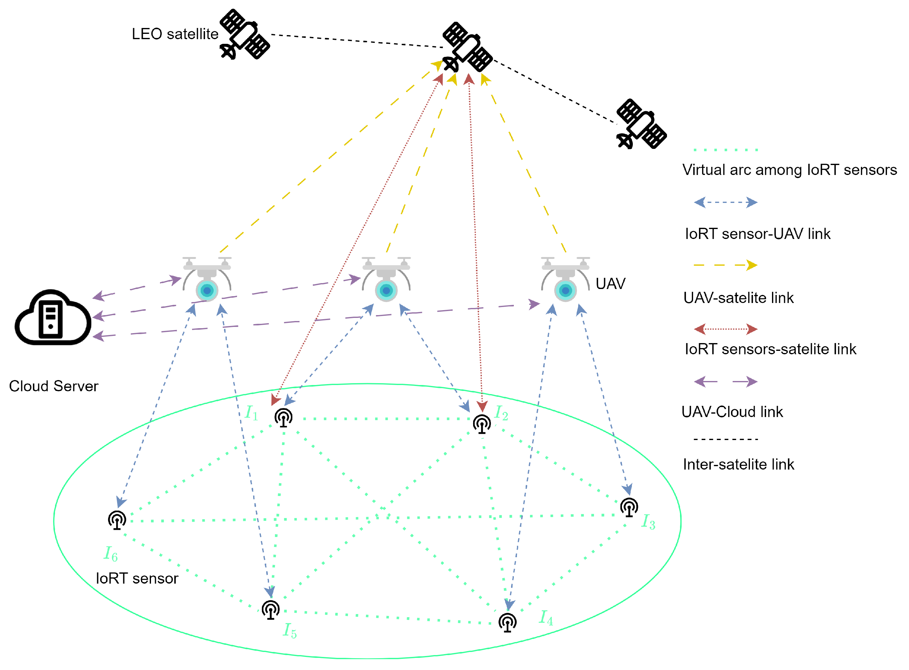| G | Ground equipment (including ground sensors, UAVs, and cloud servers) | Satellite orbit altitude | |