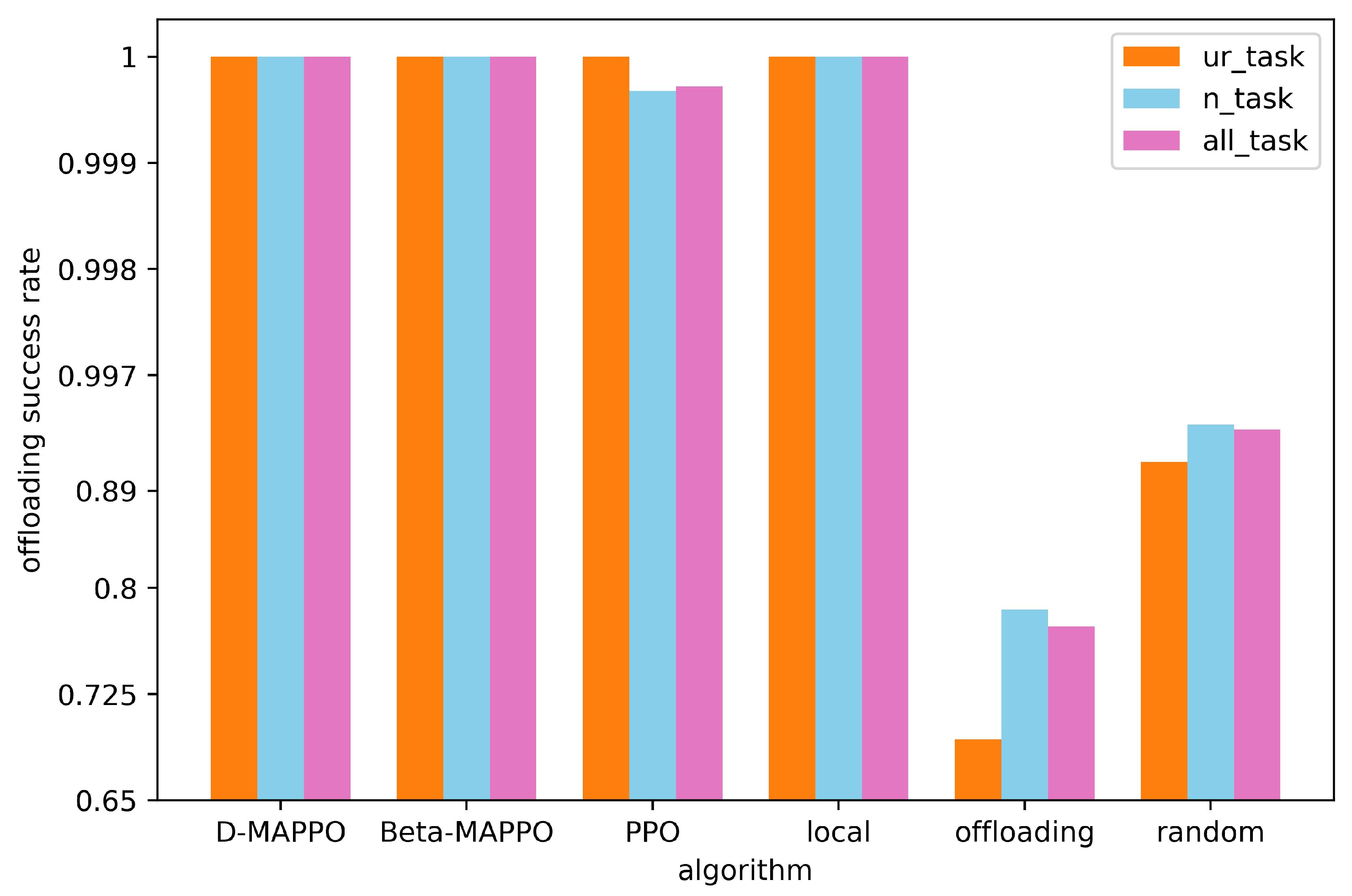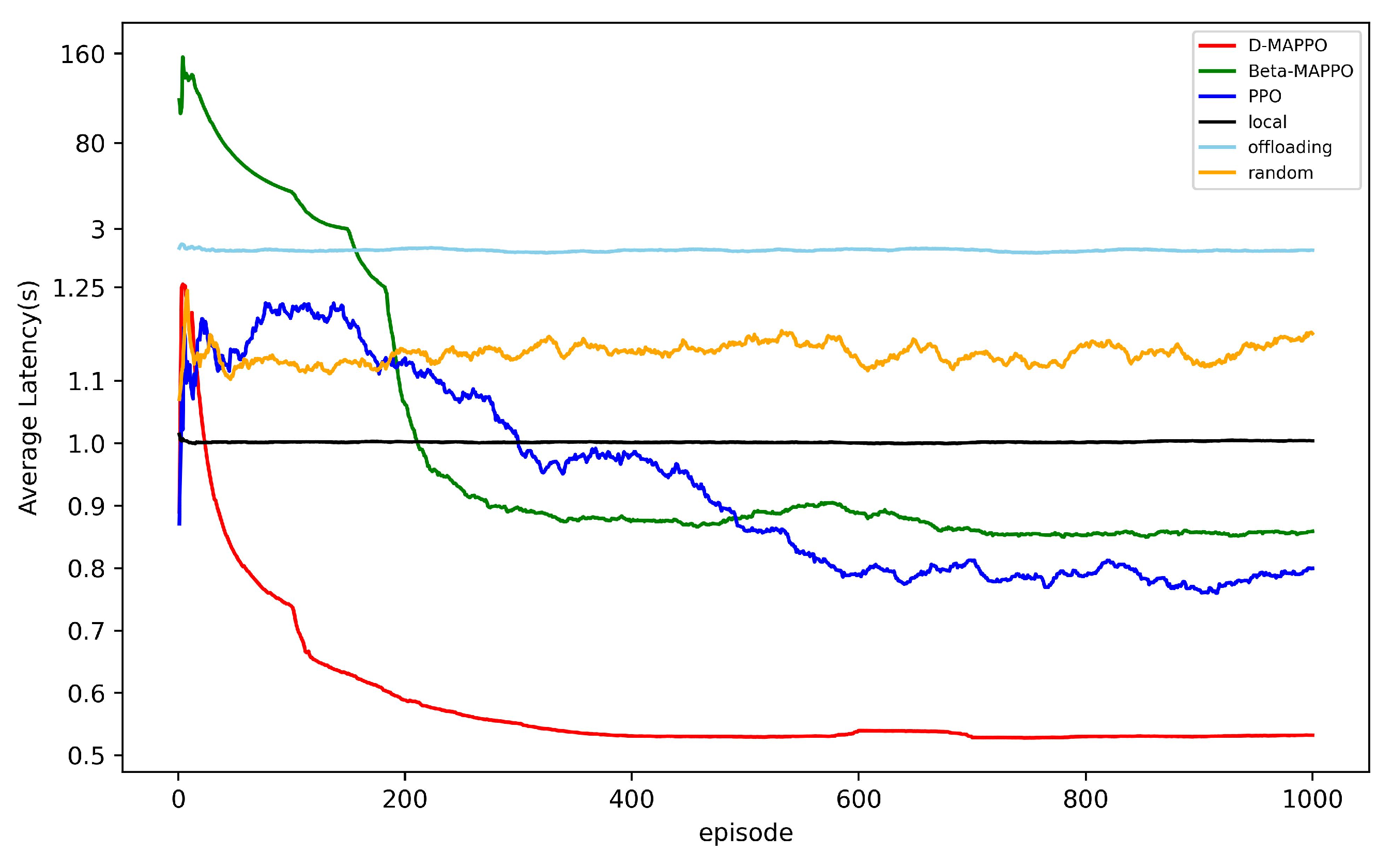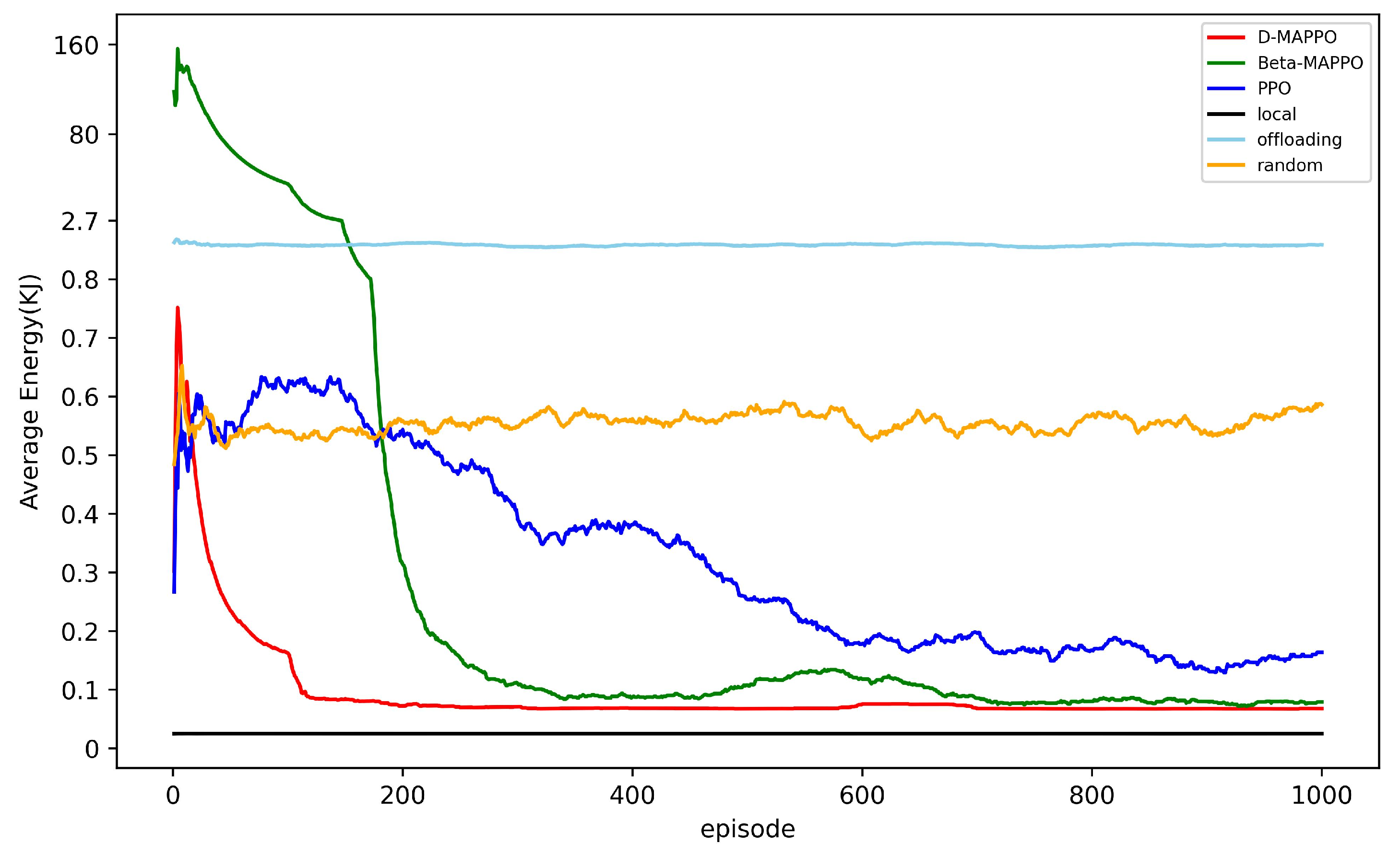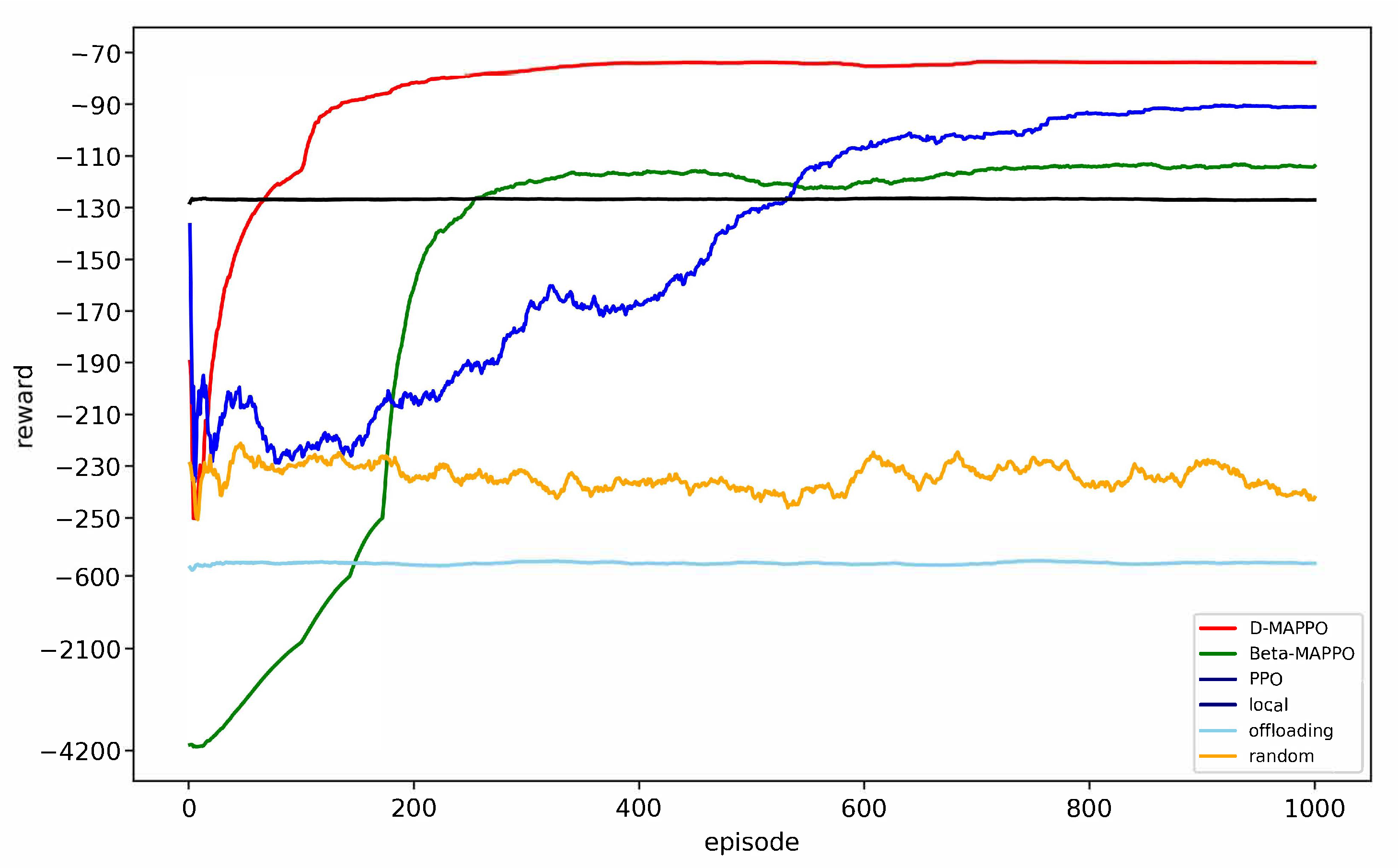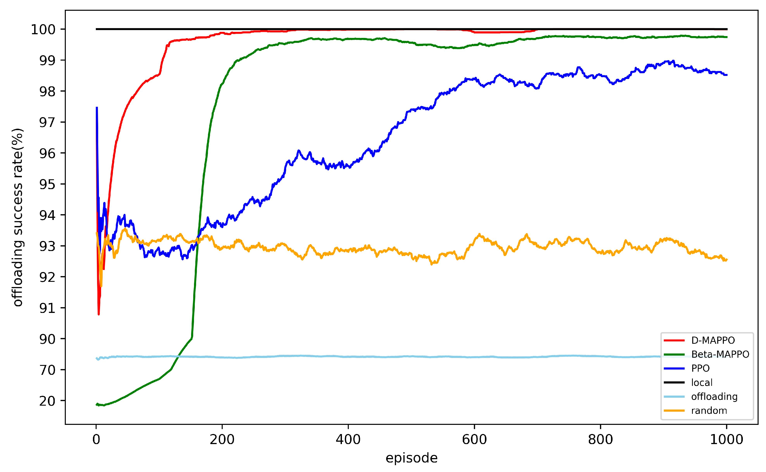 - Extensive simulation results demonstrate that the D-MAPPO algorithm achieves faster and more stable convergence. Moreover, it consistently outperforms benchmark methods—including Beta-MAPPO, PPO, Local, Offloading, and Random—in terms of latency reduction, energy efficiency, and offloading success rate.