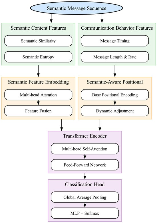 The input to our Transformer model is the fused embedding , which combines the semantic and feature embeddings with the semantic-aware positional encoding. This rich input representation provides the Transformer with comprehensive information about both the content and context of semantic messages. The Transformer encoder consists of multiple stacked layers, each containing multi-head self-attention mechanisms and feed-forward networks, designed to capture long-range dependencies in the semantic sequence and model complex threat patterns that may span multiple messages.