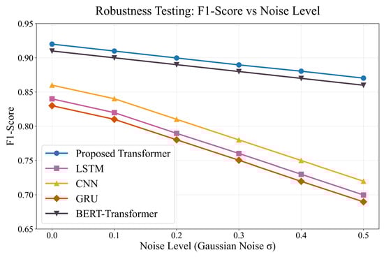 To simulate semantic adversarial attack scenarios, noise and perturbations are injected into the test set. The proposed model maintains an F1-score above 0.89 under noisy conditions where baseline models drop by 5–10%, benefiting from the dynamic positional embedding’s adaptability to semantic mutations. Figure 2 illustrates the F1-score versus noise level, and Figure 3 shows the performance degradation under different noise conditions. Our model demonstrates superior robustness across all noise levels compared to baseline models.