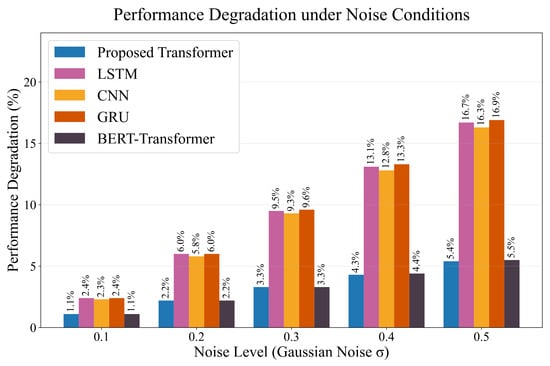 Performance degradation percentage under different noise conditions. The proposed Transformer model maintains better performance stability compared to LSTM, GRU, CNN, and BERT-Transformer baselines.
