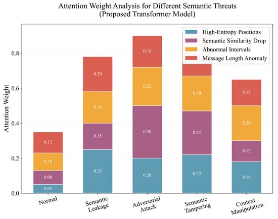 Attention weight analysis for different semantic threats in the proposed Transformer model. The model shows heightened attention to high-entropy positions and semantic similarity drops during adversarial attacks.
