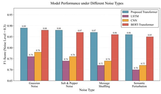 Model performance comparison under different noise types (noise level = 0.3). The proposed Transformer maintains superior performance across Gaussian noise, salt-and-pepper noise, message shuffling, and semantic perturbation scenarios.