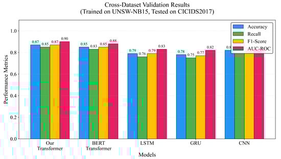 Cross-dataset validation results. Models trained on UNSW-NB15 and tested on CICIDS2017. The proposed Transformer model demonstrates superior generalization capability across all metrics compared to LSTM, GRU, CNN, and BERT-Transformer baselines.