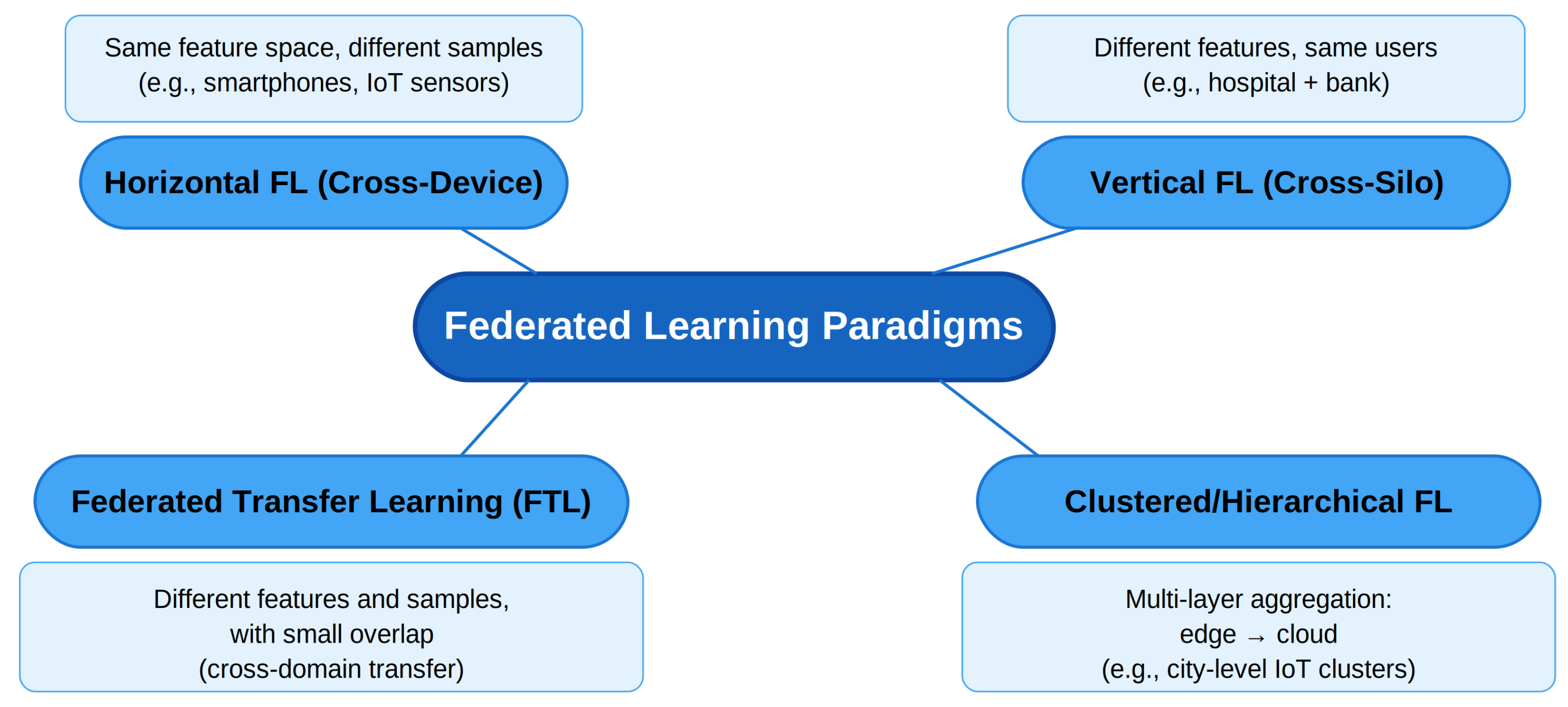 Figure 1. Main paradigms of Federated Learning. Horizontal FL (cross-device) assumes clients share the same feature space but hold different data samples, as in mobile or IoT networks. Vertical FL (cross-silo) involves organizations with shared user identifiers but disjoint feature spaces, such as collaborations between healthcare and finance institutions. FTL applies when datasets differ in both features and samples, with limited overlap enabling cross-domain knowledge transfer. Clustered or hierarchical FL organizes clients into multi-layer architectures (edge → cloud), reducing communication costs and improving performance under non-IID data distributions.