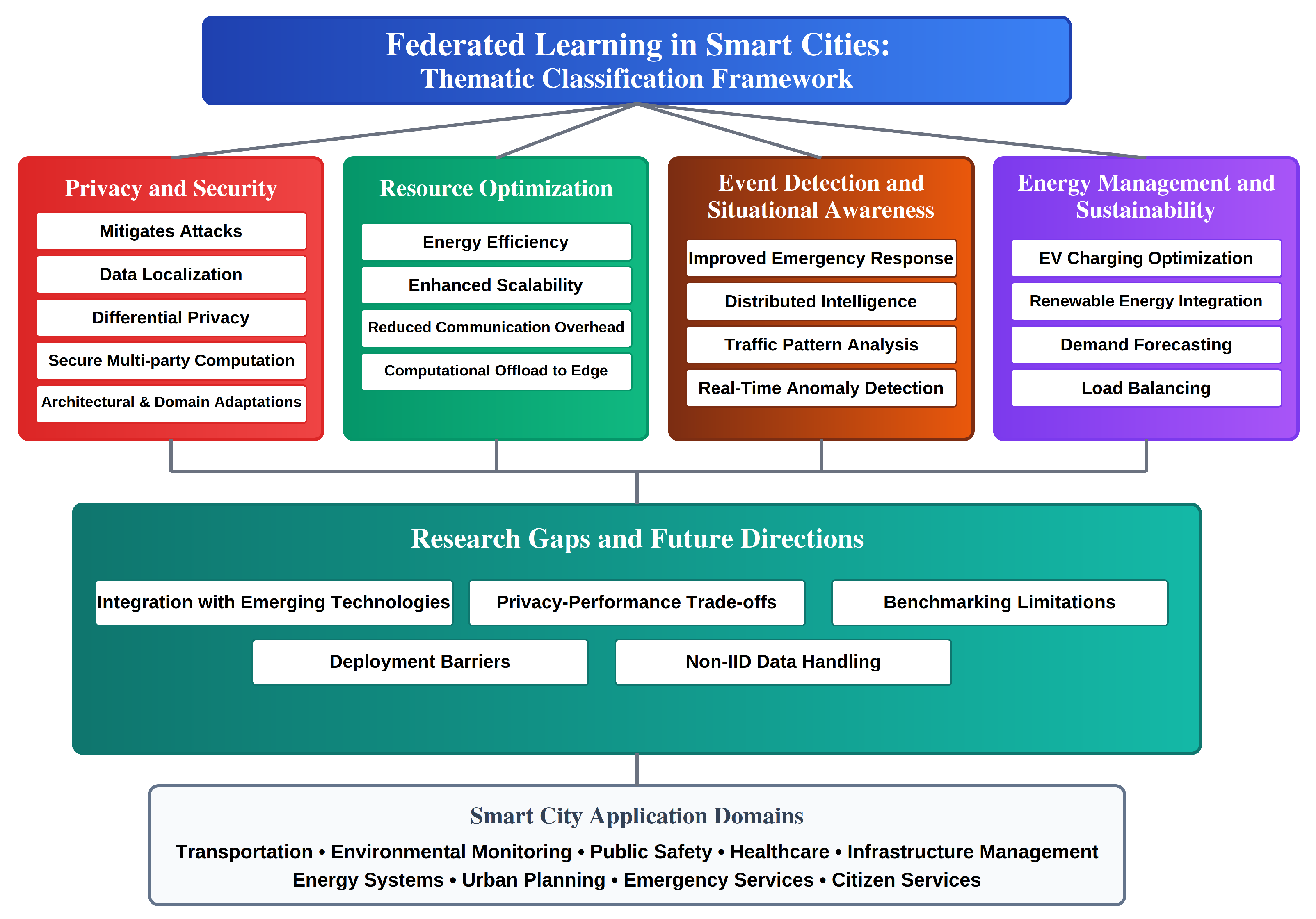 ScopeCross-cutting smart city challenges: privacy, optimization, event detection, energy sustainabilityDomains such as transportation, healthcare, UAVs, governanceBroad range of applications: healthcare, transportation, energy, securityCommunication-efficient FL in edge environments