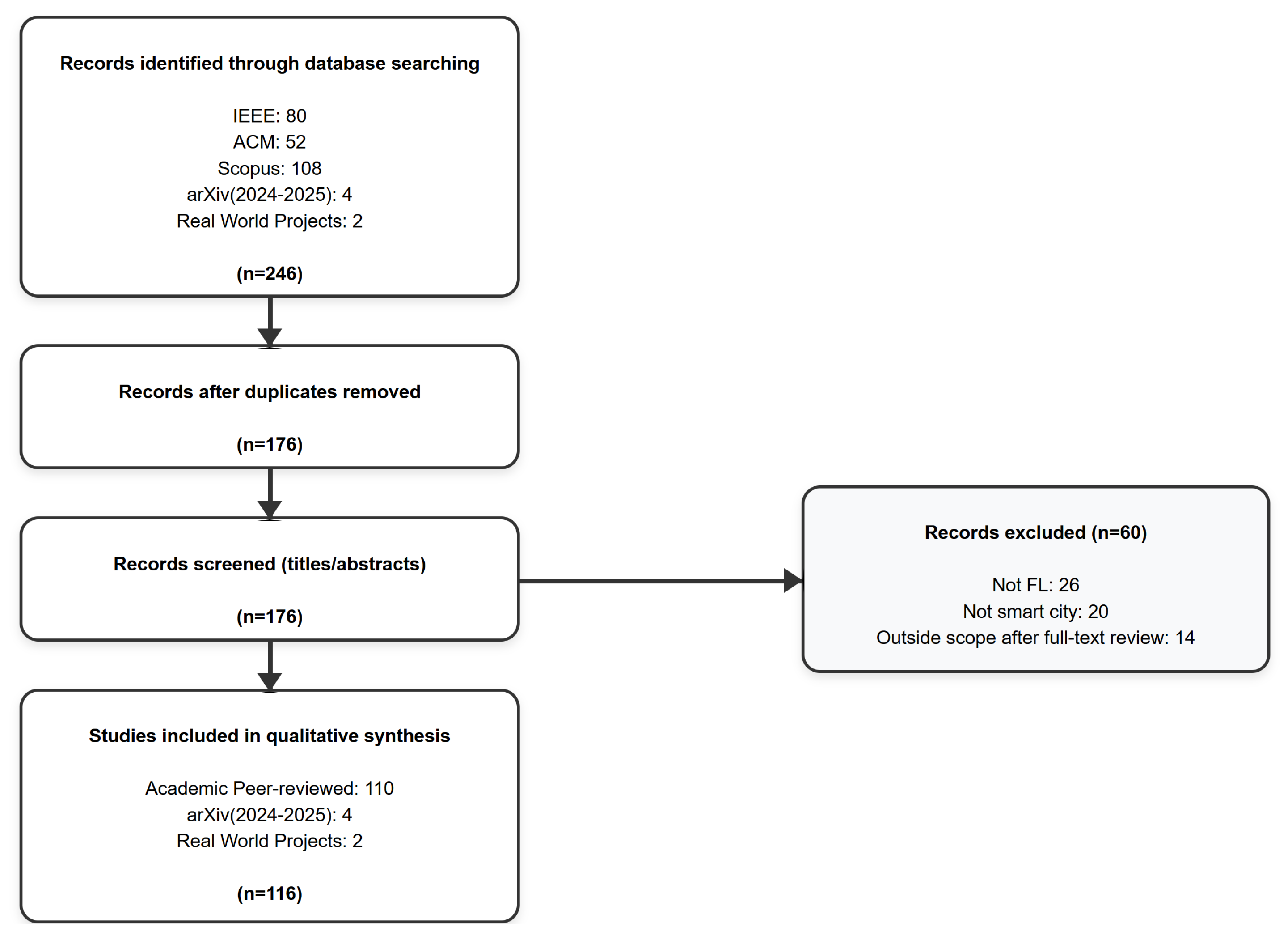 After deduplication, there were 176 unique records. The titles and abstracts were then selected for relevance to FL and smart city contexts. Articles were excluded if they did not address federated learning (26 cases), did not have a clear connection to urban applications (20 cases) or did not present substantive findings (14 cases). This left 110 articles for full-text review. Following validation, our final corpus consisted of 116 works: 110 peer-reviewed studies, 4 arXiv preprints, and 2 project reports. Although we clearly distinguish non-peer-reviewed contributions in our analysis, including them enabled us to capture cutting-edge developments and deployment insights in this fast-moving area.