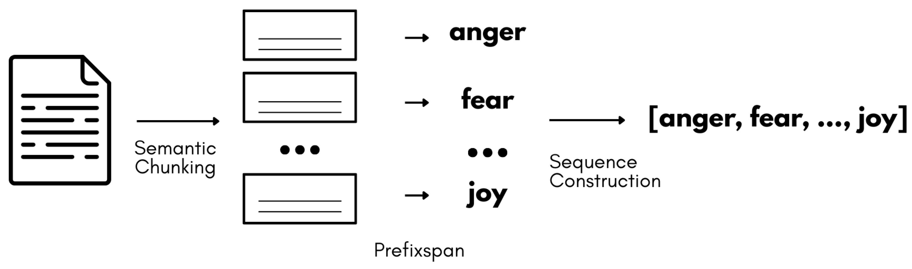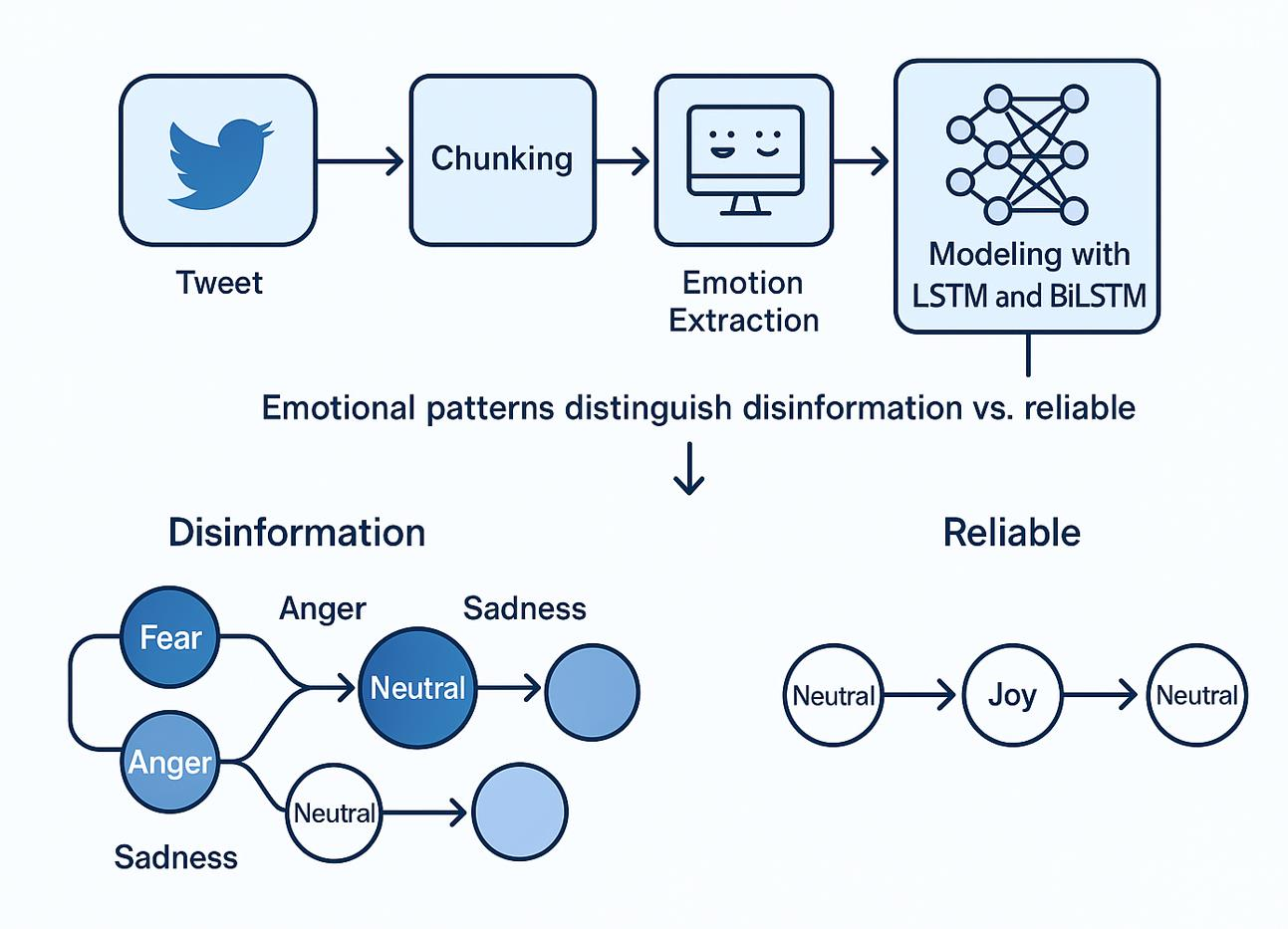 9]. To address this gap, the present study proposes the use of emotional sequences—that is, the temporal order of emotions expressed in a text—as a new discriminatory signal for identifying disinformation on social media. Specifically, we operationalize emotional sequencing at the subsentence level and show that temporal progressions provide discriminative information beyond aggregate sentiment or emotion counts.