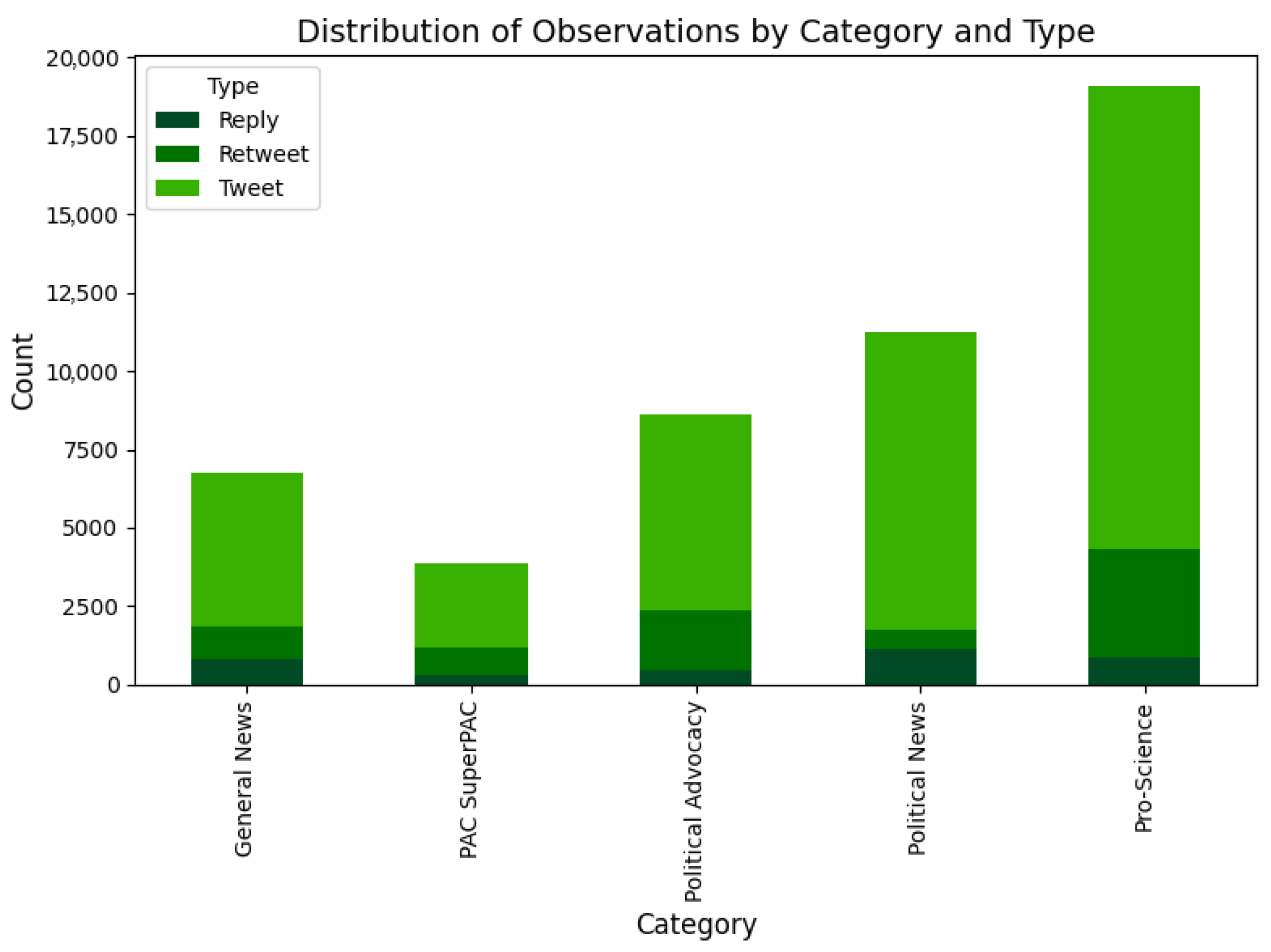Figure 2 display the number of tweets, retweets, and replies across categories.