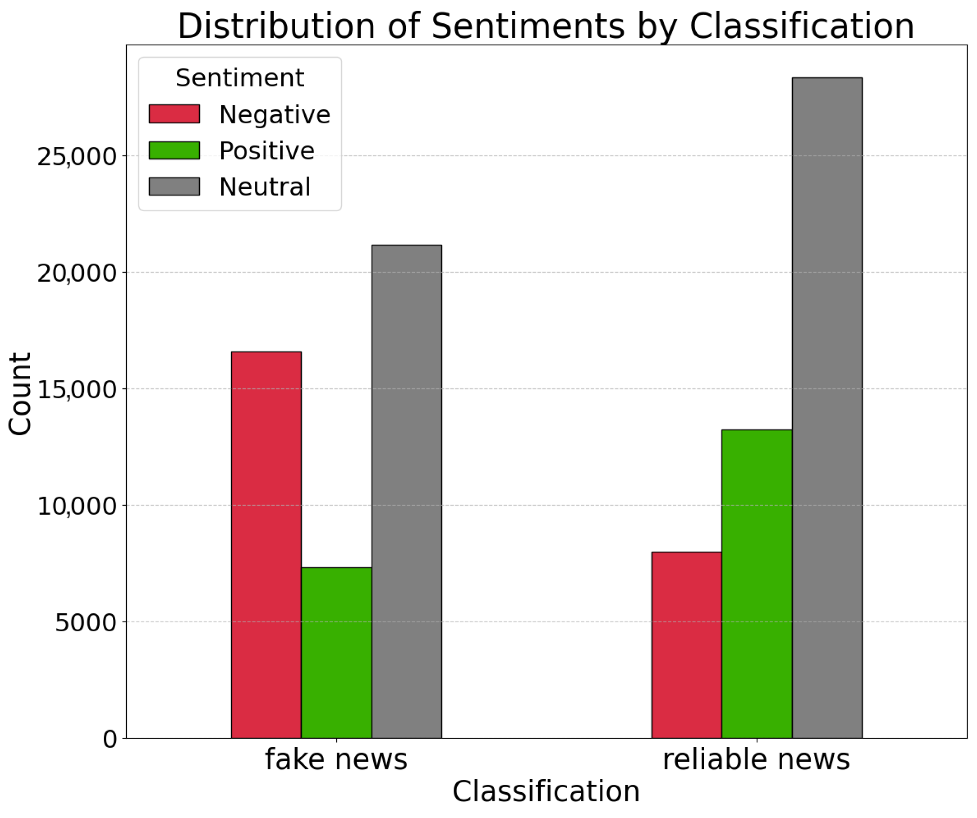 Tweets from disinformation sources exhibit a higher proportion of negative sentiment, while tweets from reliable sources predominantly display positive and neutral sentiment. Among fake news tweets, neutral and negative sentiments appear with similar frequency, both clearly exceeding the occurrence of positive sentiment. In contrast, among reliable news tweets, most messages are classified as neutral, followed by a substantial proportion of positive messages, and only a smaller proportion expresses negative sentiment.