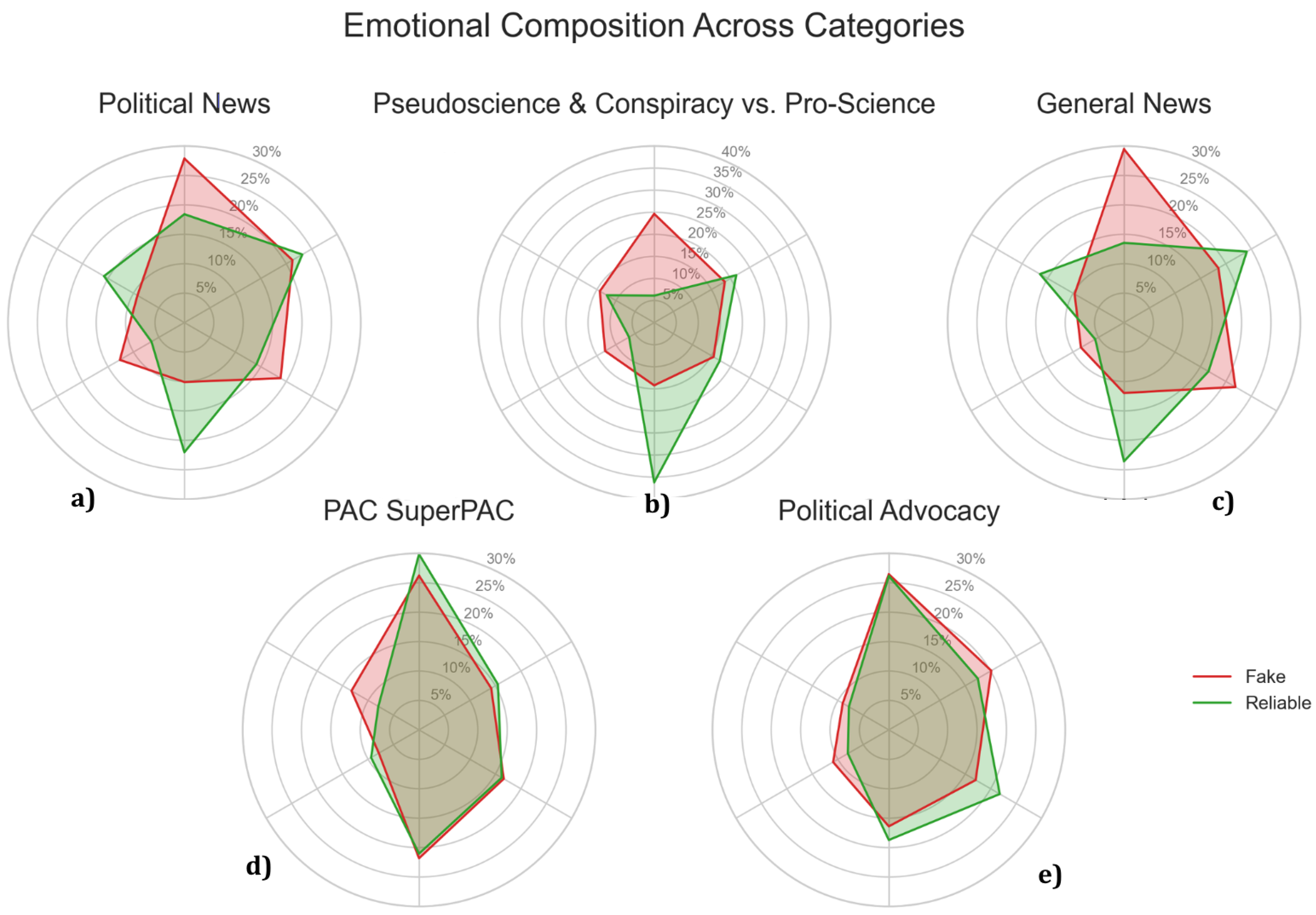 Section 6 show that disinformation content is characterized by emotionally dense and cyclic sequences dominated by fear, anger, and sadness, whereas reliable news displays more linear and balanced emotional progressions. This contrast suggests that deceptive messages deliberately exploit high-arousal negative emotions to attract attention, sustain engagement, and reinforce ideological alignment. Such patterns are consistent with prior research indicating that emotional intensity, particularly fear and anger, increases message diffusion and perceived credibility [