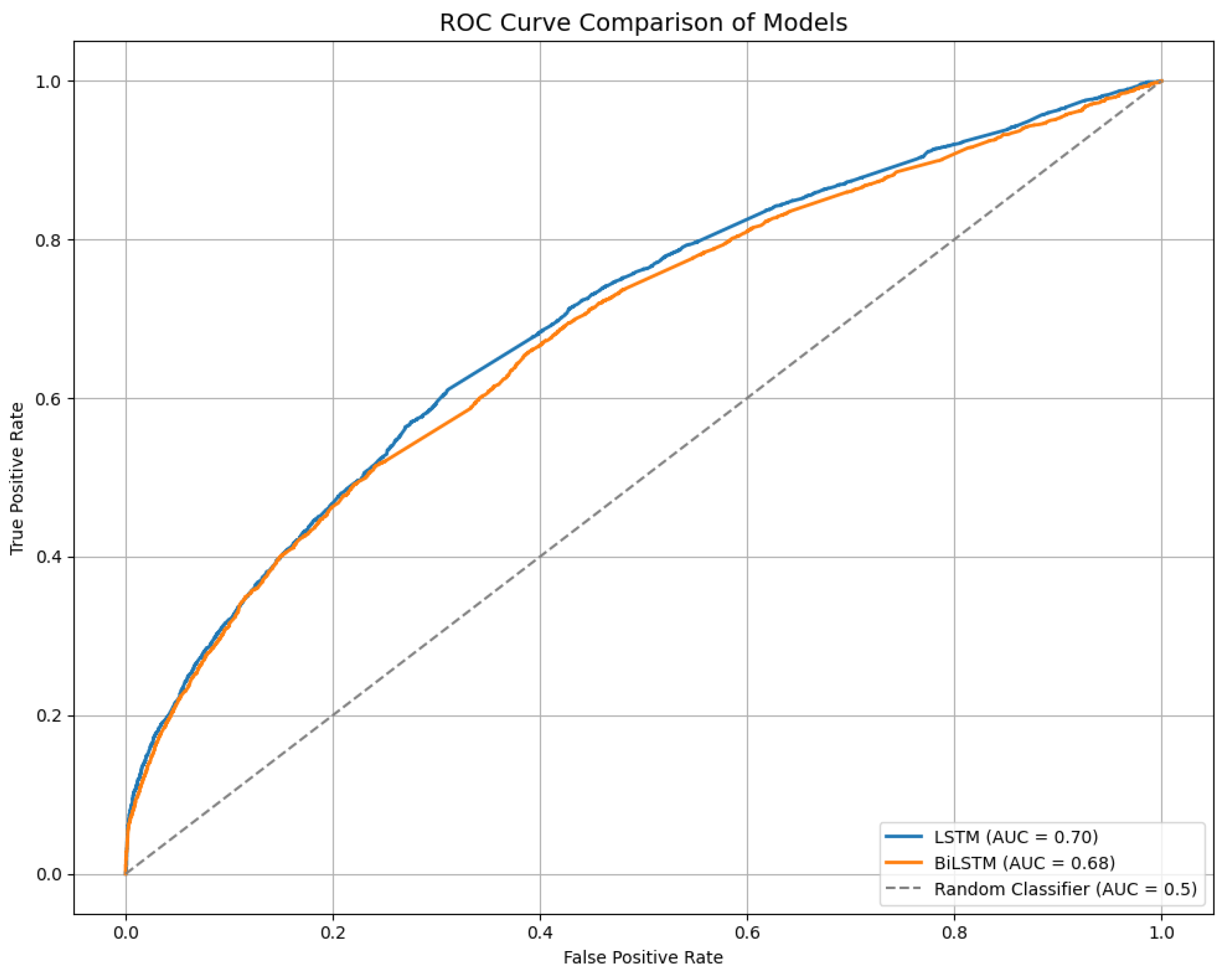 Table 13. The LSTM model achieved a precision of 0.5443, recall of 0.7322, F1-score of 0.6244, and accuracy of 0.6265. The BiLSTM model obtained a precision of 0.5541, recall of 0.6776, F1-score of 0.6097, and accuracy of 0.6321. These results indicate that class weighting was effective in increasing the sensitivity to the fake class, especially in the LSTM model, which maintained a strong balance between precision and recall.