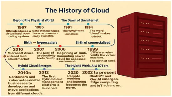 Figure 1 highlights the evolution of cloud computing from virtualization in 1967 to modern AI, the Internet of Things (IoT), and edge computing. It highlights key developments, such as SaaS, hybrid cloud, and the shift toward intelligent and distributed systems.