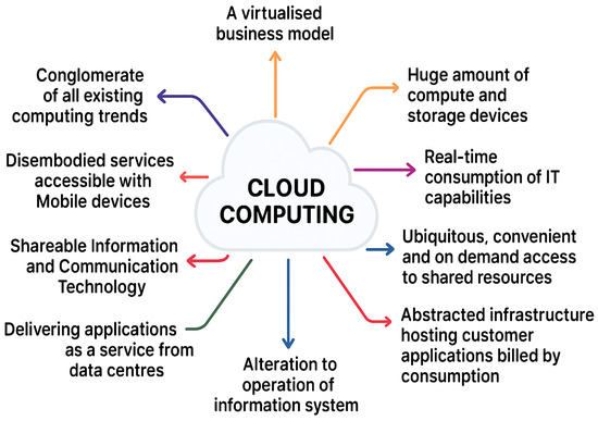 Cloud refers to a model of service delivery that enables users to access IT resources such as servers, storage, and software from a shared pool on the internet, thereby providing ubiquitous and on-demand access [33,34]. In the same way that a utility functions, it abstracts the complexities of underlying hardware and software infrastructures from end users. Most importantly, the term “cloud” gained the most user traction in 2006, which led to a surge in its popularity [35]. The term “cloud computing” refers to a specific area of interest within distributed computing, specifically the delivery and use of services provided by providers such as Google, IBM, Amazon, and others. Although often referred to as an advanced and sophisticated paradigm, cloud computing has existed for several decades [36]. The National Institute of Standards and Technology (NIST) [4] describes cloud computing as