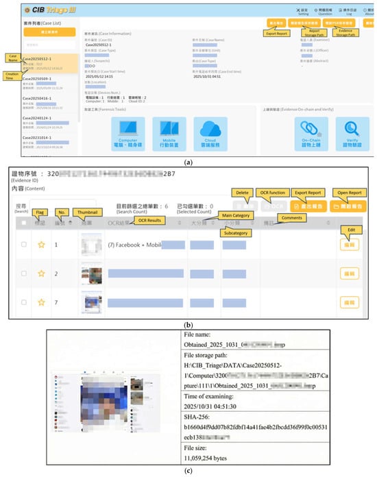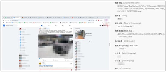 (a) CIB-Triage III integrates evidence collection tools for computers, mobile devices, and cloud data, along with mechanisms for on-chain evidence registration and verification. (b) The screenshot and recording functions within the digital forensic toolkit allow investigators to capture visual data from social networking platforms as digital evidence. (c) Each captured image is automatically annotated with metadata, including the timestamp and file size, and a cryptographic hash value is generated to verify the integrity and authenticity of the evidence.