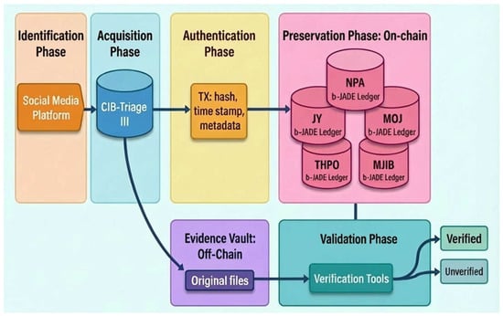 The following sections provide a detailed explanation of the proposed framework, elaborating on the identification, acquisition, authentication, preservation, and validation phases (Figure 3). Each phase is discussed in terms of its objectives, procedures, and mechanisms, illustrating how the framework systematically implements OSINT evidence management in a transparent and legally defensible manner. To further enhance clarity, Figure 4 visualizes the complete data flow from OSINT collection through identity correlation, off-chain storage, and on-chain notarization. This architectural illustration highlights the interaction between CIB-Triage III and b-JADE, the separation of trust boundaries, and the integration between on-chain and off-chain components, providing a clear understanding of how evidence moves through the system.