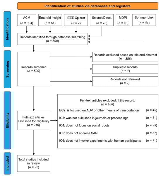 Initially, 599 articles were retrieved from the databases. After analyzing the title and abstract, 386 articles were eliminated. Two articles were not available, and one article was duplicated. As a result, 210 articles were analyzed to determine whether they met the inclusion criteria. Articles were excluded because: (i) they were focused on autonomous underwater vehicles (); (ii) they were not published in journals or conference proceedings (); (iii) they did not focus on social robots (); (iv) they did not address socially aware navigation (), and (v) they did not conduct experiments with human participants (). Specifically, we used the SAN definition as a part of the criterion to dismiss experiments that did not consider a behavioral strategy in terms of space management [,,,,,,,,,,,,,,,,,,,,,,,,,,,,,,,,,,,,,,,,,,,,,,,,,,,,,]. Only 22 articles met the inclusion criteria and were included in this review for further analysis (see Figure 2).