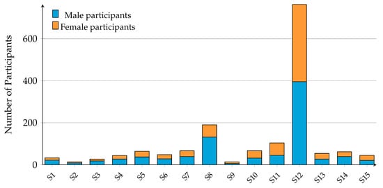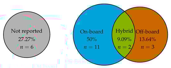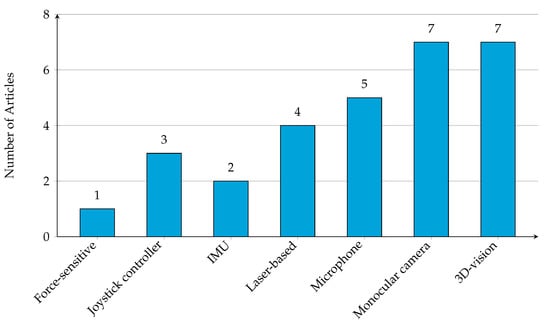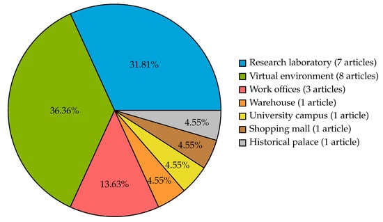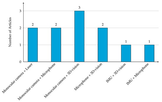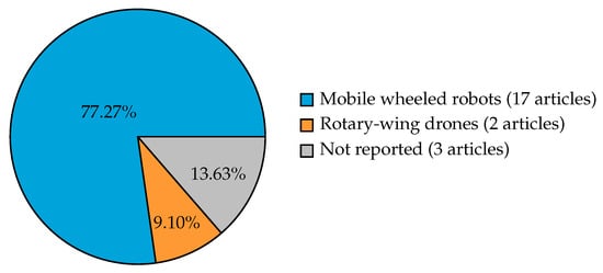 Based on the robot locomotion, the robots employed in the articles could be classified as mobile wheeled robots. Most articles (77.27%) employed mobile wheeled robots (17/22: [,,,,,,,,,,,,,,,,]), while a few articles (9.10%) employed rotary-wing drones (2/22: [,]). Nevertheless, based on the information provided by the articles, we were unable to identify the locomotion mechanism used in 13.63% of the articles (3/22: [,,]). Figure 3 summarizes the robot locomotion mechanisms used in the articles.