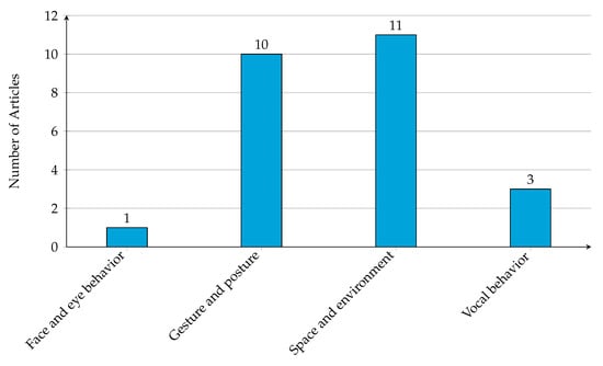 - Behavioral cues: According to Vinciarelli et al. [], behavioral cues “describe a set of temporal changes in neuromuscular and physiological activity that last for short intervals of time”. In this regard, they grouped the cues into several classes. For this scoping review, physical appearance, gesture and posture, face and eye behavior, vocal behavior, and space and environment will be used as behavior cue classes.