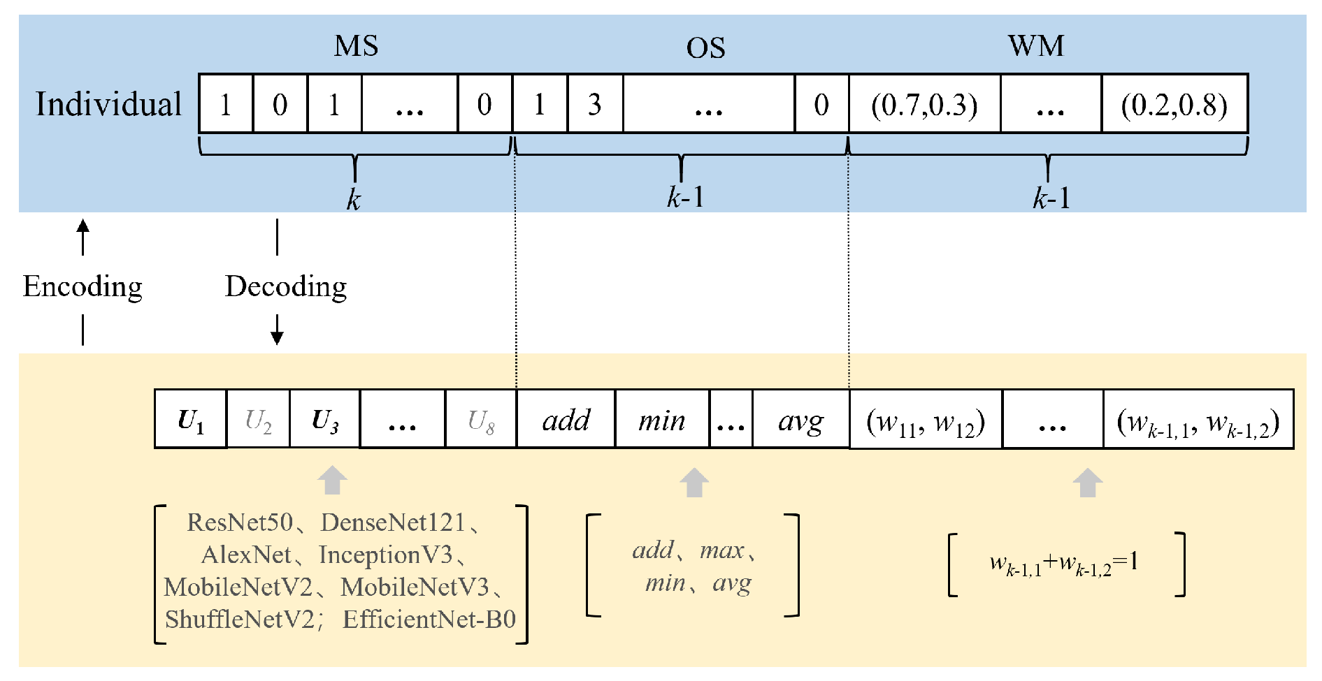 The evolutionary individual is encoded as a three-component structure p = [ M S , O S , W M ] , representing feature selection, the fusion operator sequence, and weight matrix allocation, as illustrated in Figure 2. The individual components are defined as follows: