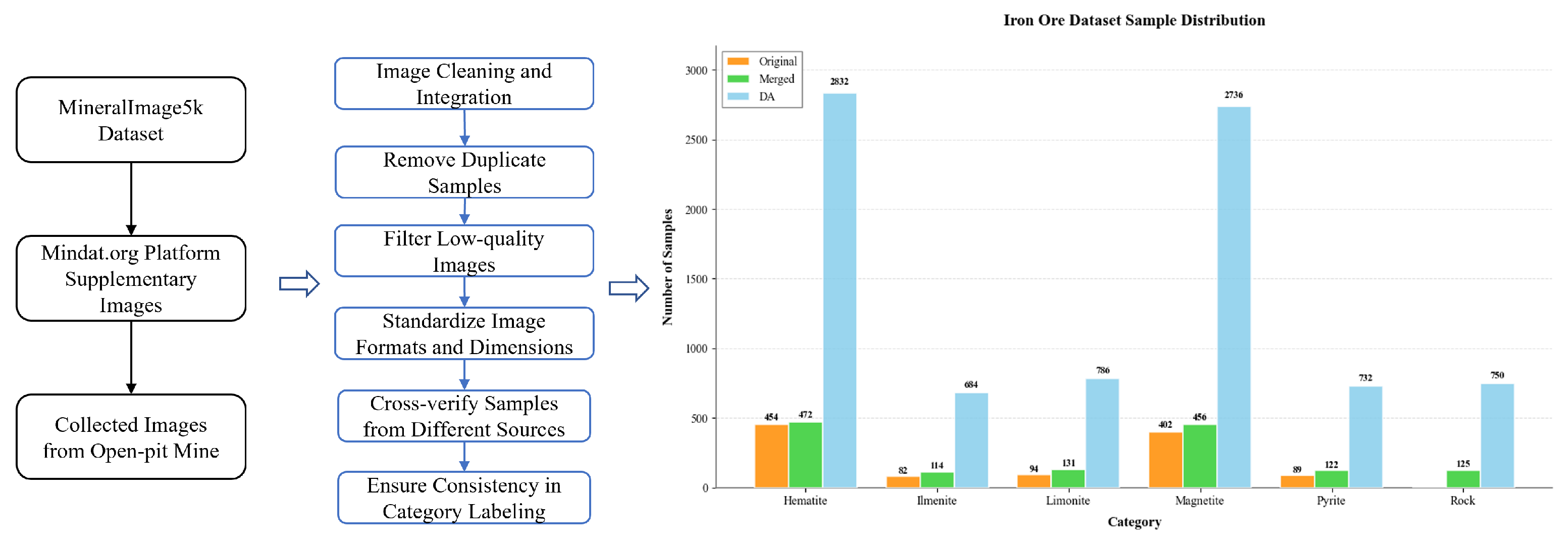 Figure 3. Flowchart of iron ore dataset construction and comparison of class distribution.