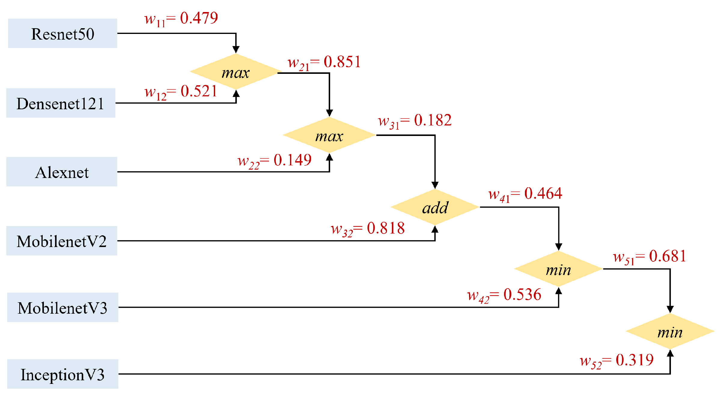 Figure 5. EDF-NSDE optimal fusion tree on original dataset: backbones extract features in parallel, followed by sequential element-wise fusion.