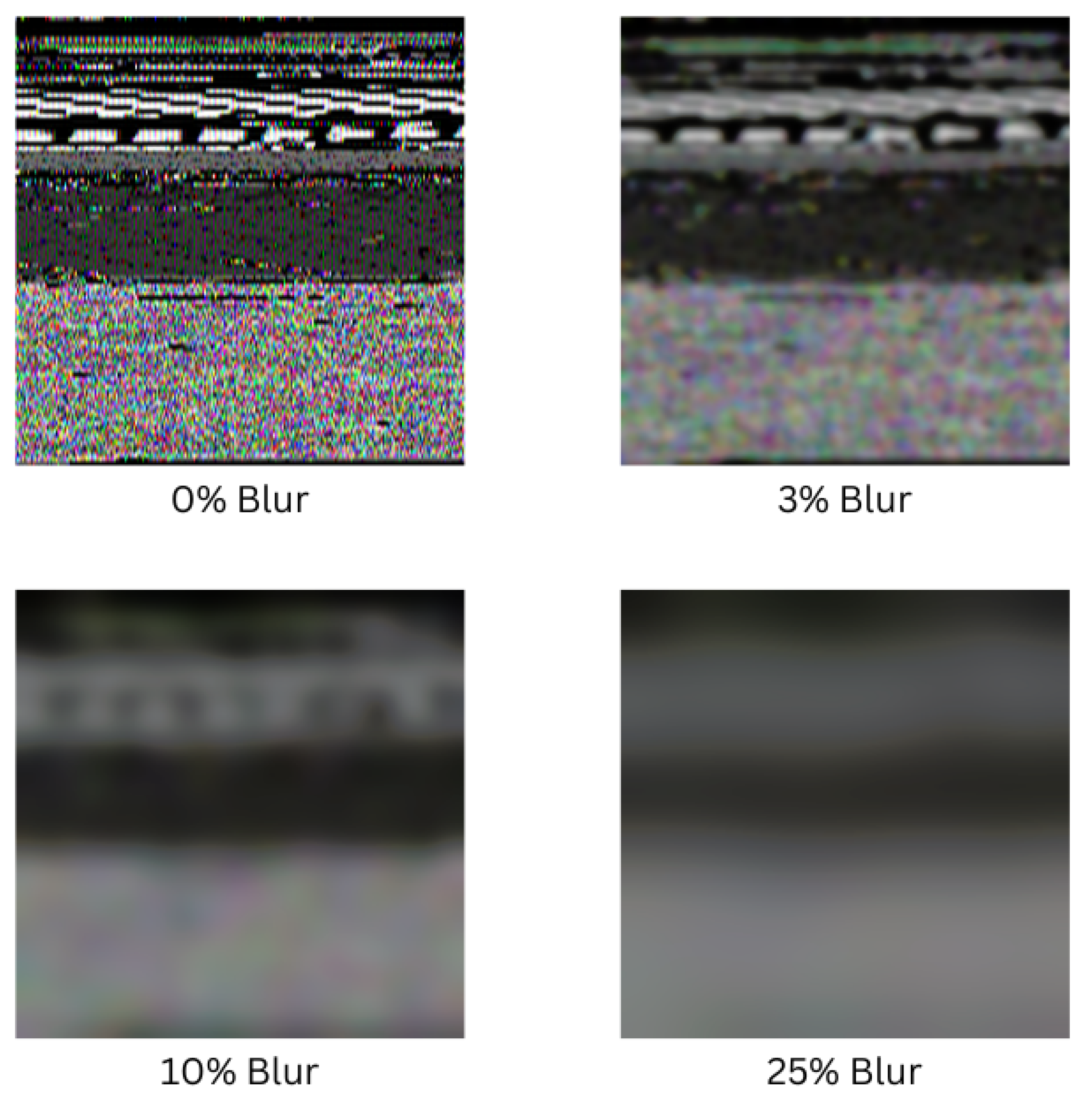 corresponds to the 3%, 10%, and 25% blur levels, respectively. This formulation ensures that blur severity is proportional to overall image size and therefore consistent across datasets with different dimensions. The Gaussian kernel applied was