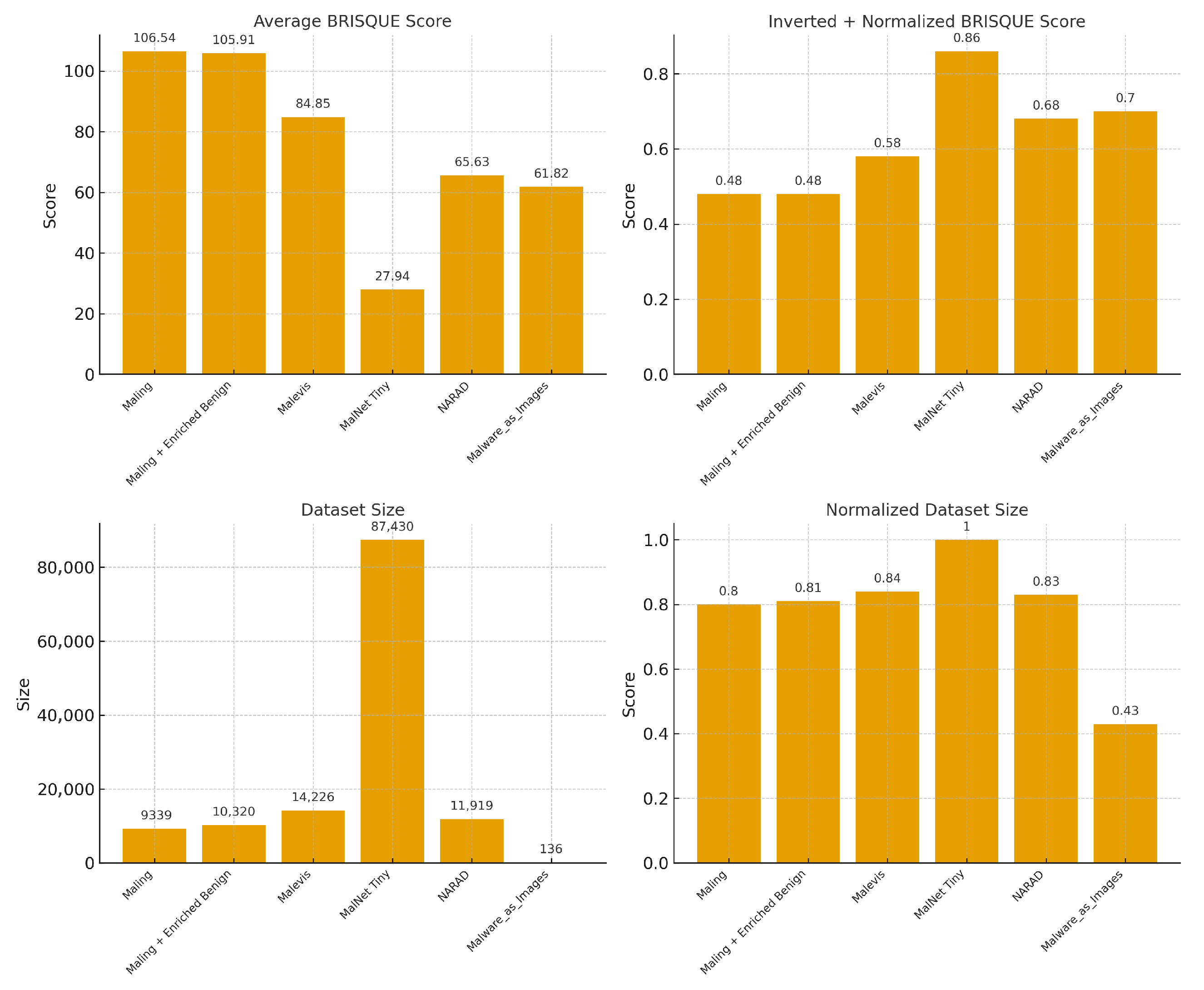 The Malnet Tiny subset achieved the best average BRISQUE score of 27.94, resulting in an inverted and normalized BRISQUE score of 0.86. It is the largest and best-performing dataset used, with 87,429 samples, translating to a fully normalized dataset size score of 1.0. These dataset excels in all defined metrics, achieving the highest MalScore of 95%.