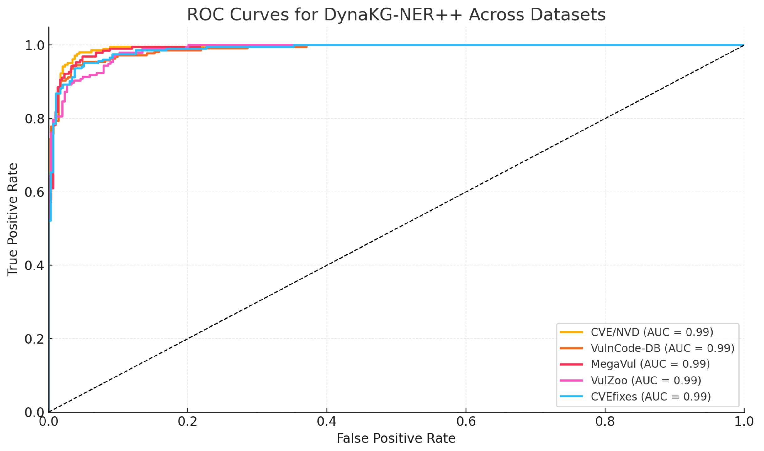 Figure 1 shows that DynaKG-NER++ consistently achieves high AUC values between 0.92 and 0.95 across all benchmarks, indicating strong discriminative ability regardless of dataset domain or structure. Notably, the AUC on CVE/NVD is slightly higher, reflecting the relative clarity of natural-language vulnerability descriptions and their direct alignment with knowledge-graph entities. In contrast, MegaVul exhibits a marginally lower but still strong AUC, which can be attributed to the dataset’s long, deeply nested functions and noisier line-level annotations that inherently blur decision boundaries. The ROC curves for VulnCode-DB and CVEfixes demonstrate particularly steep true-positive rises at low false-positive rates, highlighting the effectiveness of the contrastive learning component in distinguishing vulnerable functions from their patched counterparts. Overall, the ROC results confirm that DynaKG-NER++ maintains stable discrimination performance across heterogeneous data sources, with only minor variations that correspond closely to the structural and annotation characteristics identified in the qualitative error analysis.