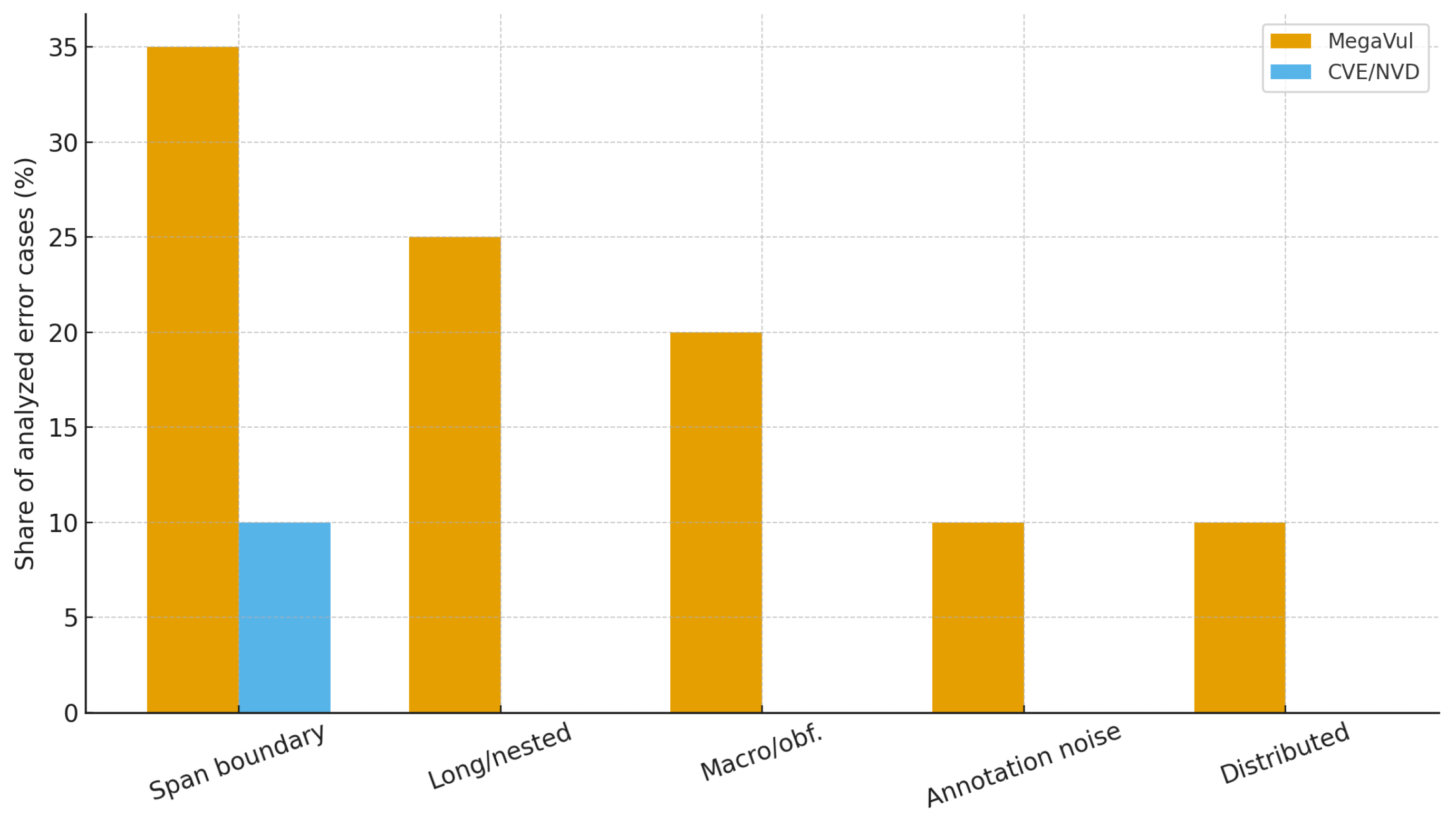 Figure 2 provides dataset-level confusion matrices, a qualitative examination of model errors offers deeper insight into why DynaKG-NER++ performs differently across datasets. We focus primarily on the MegaVul dataset because it contains long, real-world C/C++ functions with line-level annotations, making it well-suited for identifying structural and semantic failure modes. We contrast these findings with error patterns from CVE/NVD, which consist of natural-language vulnerability descriptions rather than raw source code.
