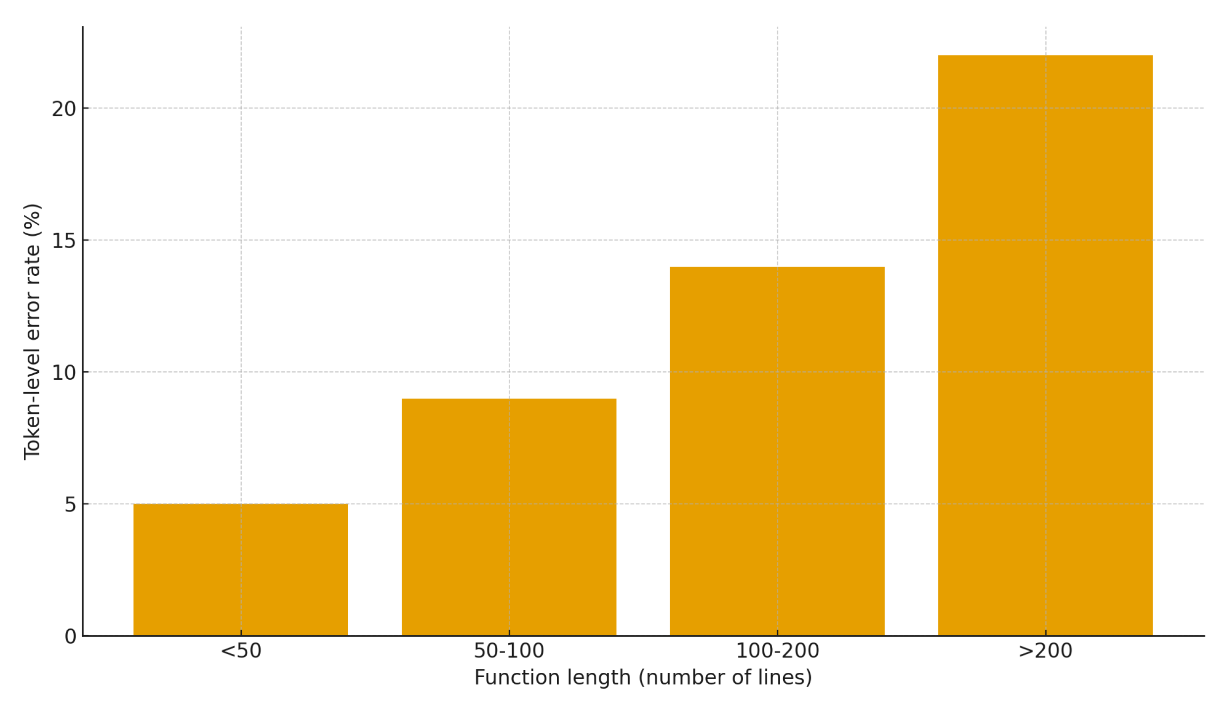 Figure 4. Functions longer than 200 lines produce significantly higher token-level error rates due to diluted contextual cues and more dispersed vulnerability indicators.