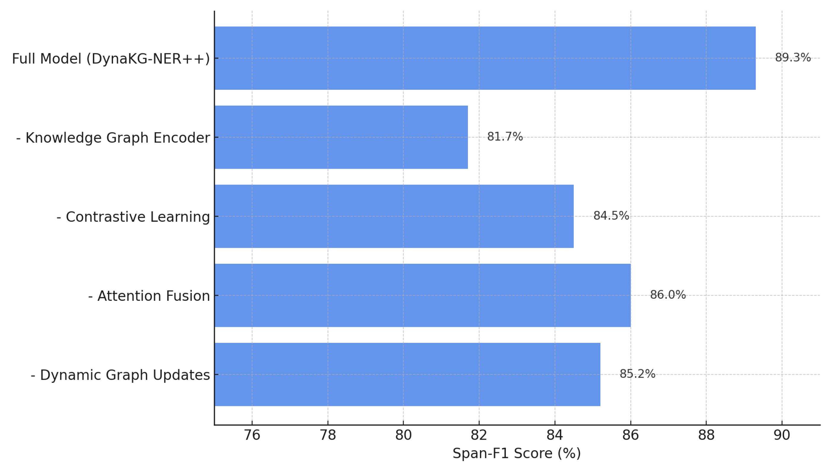 Figure 5, removing the knowledge graph encoder yields the largest degradation, reducing span-level F1 from 89.3% to 81.7%. Substantial declines are also observed when contrastive learning is removed (84.5%) and when the attention-fusion mechanism is disabled (86.0%). Notably, disabling the dynamic graph update mechanism reduces the F1-score to 85.2%. This decline aligns with the empirical analysis, where dynamic updates introduce new CVE entities and relations at an average rate of 35–90 triples per batch, improving the model’s ability to reason over newly emerging structures.