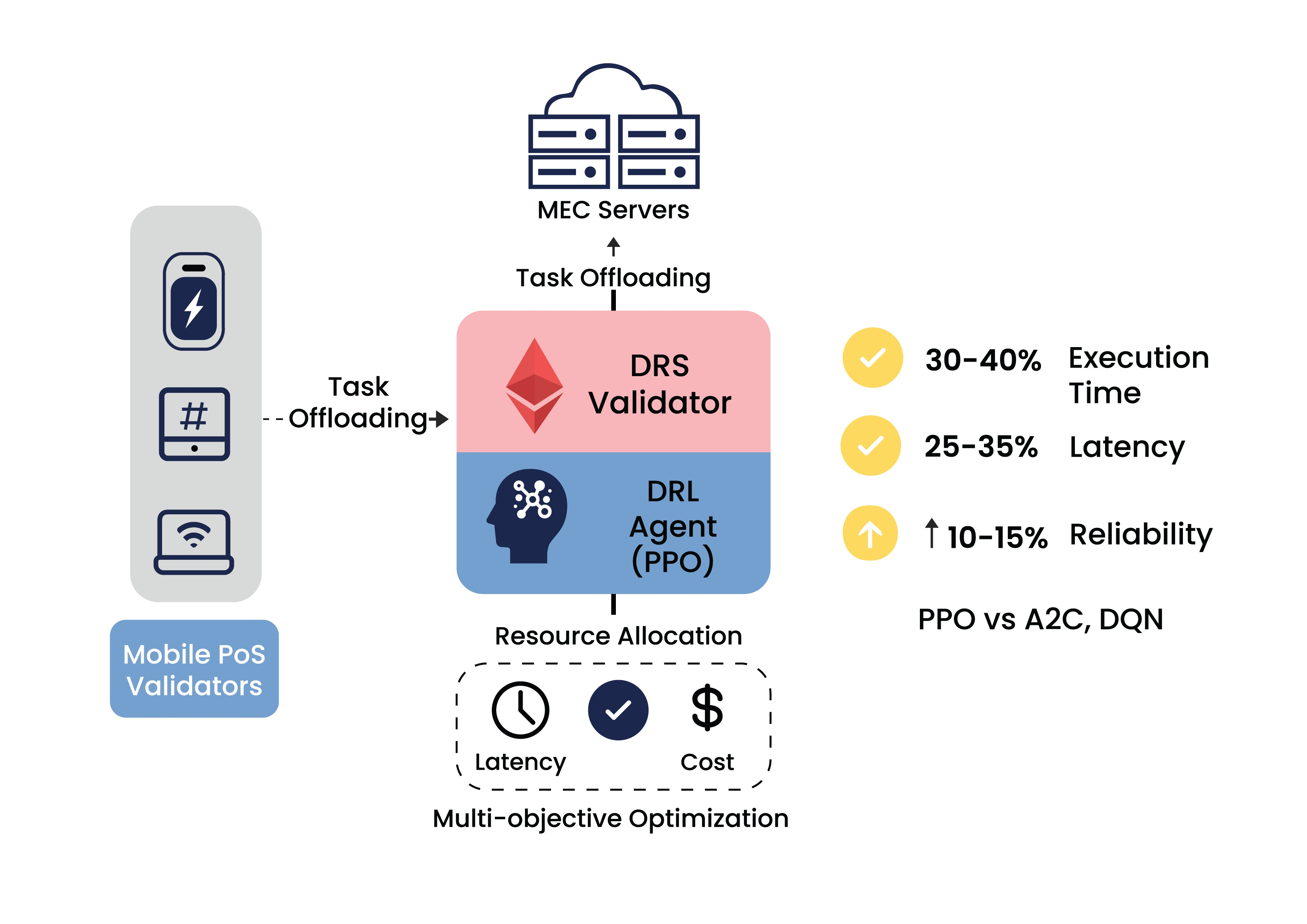 26] present a blockchain-assisted MEC offloading scheme in which user terminals offload sensitive tasks to a base station that executes them while blockchain consensus ensures security. They formulate a joint optimization problem to minimize user energy under delay constraints and solve it using a collective reinforcement learning approach, with simulations confirming its effectiveness. However, this work focuses on generic task offloading and minimizing user energy consumption, without addressing PoS validation or mobile validator behavior.