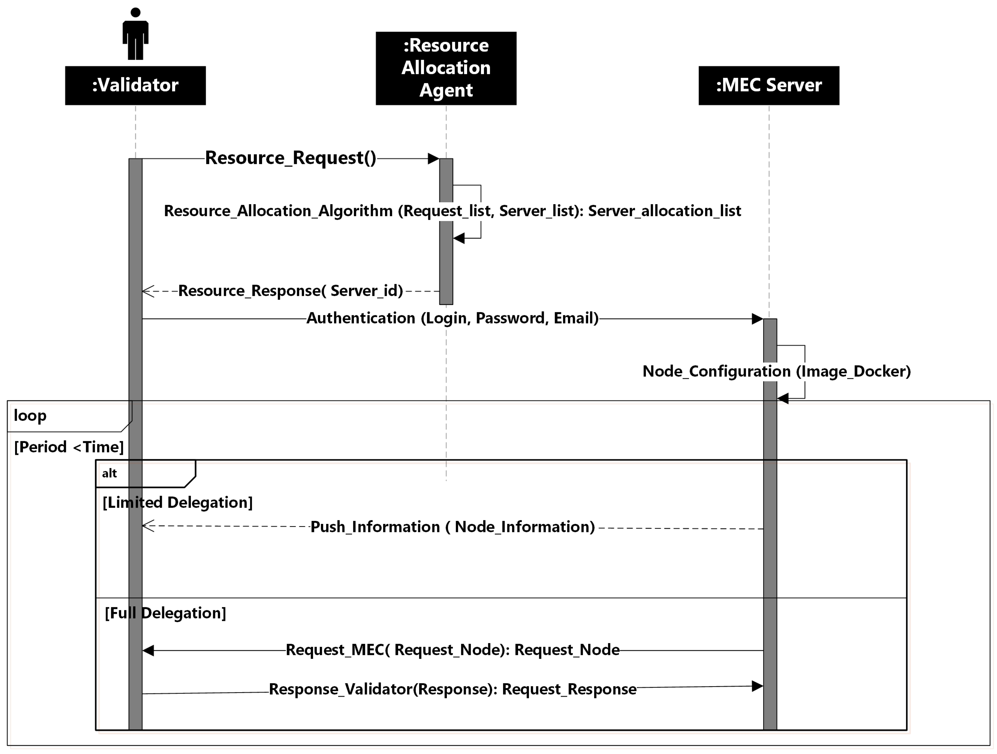 Mobile devices have different allocation periods and resources requested, depending on the validator’s needs. Similarly, edge servers are characterized by their associated processing capacities and qualities.