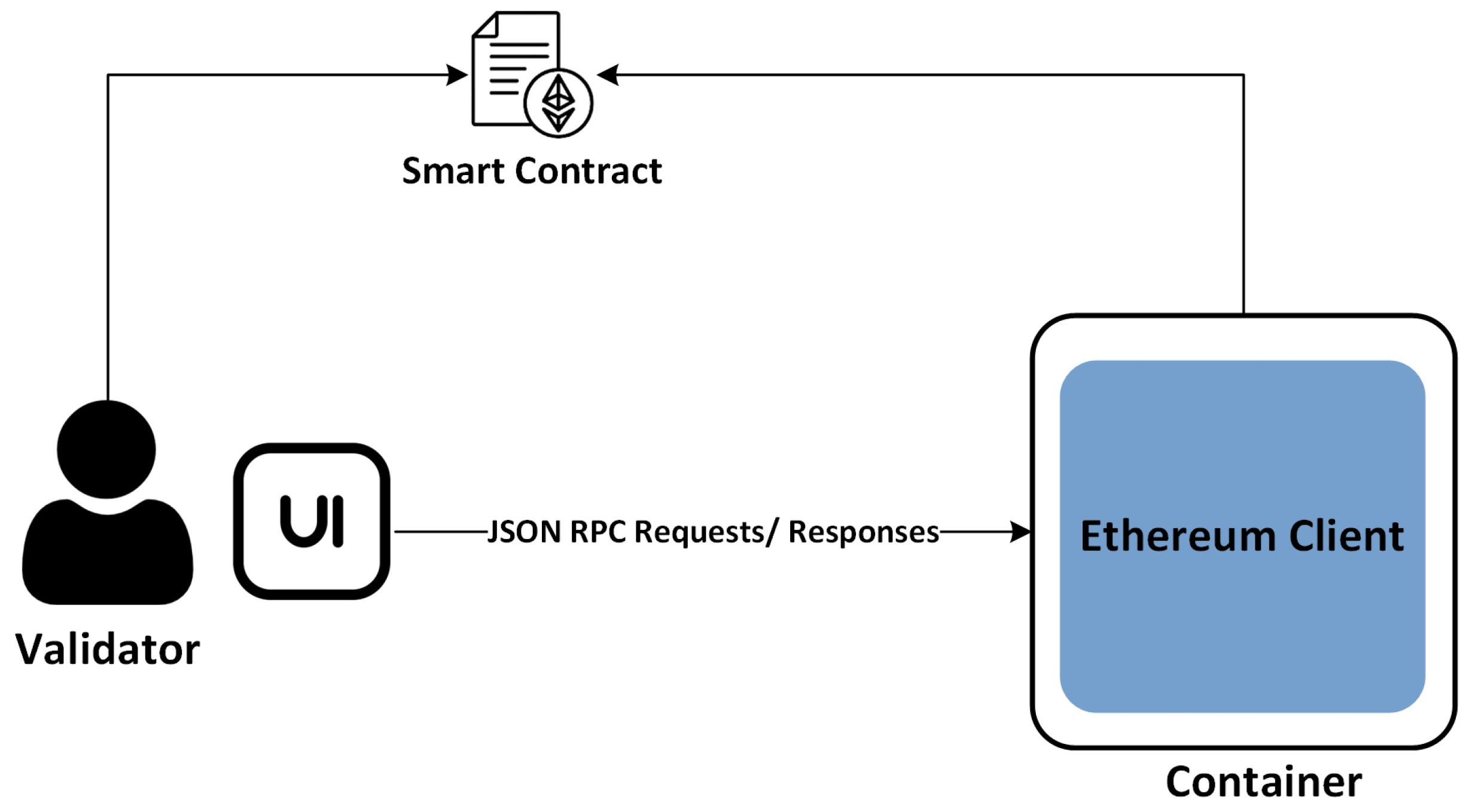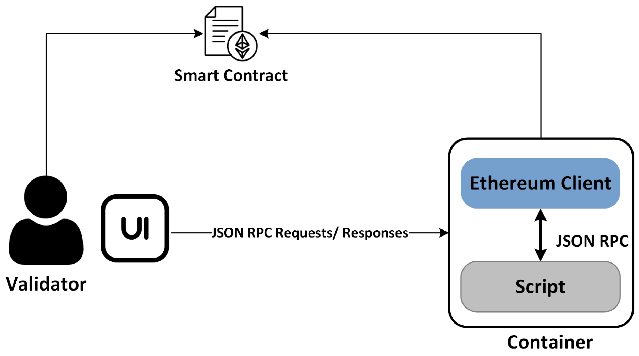 Step 3—Validator’s Node Configuration: Once the system has assigned the allocation to each validator, validators can log in to their session. At this stage, the validator faces several choices, such as the operating system, consensus client type, and runtime client type. The server will then take these choices and create a Docker image of the operating system, runtime client type, and consensus type. The server will then execute this image to launch the container, making the server ready to run the validator node. Once the configurations have been completed, the server will import the validator’s validation key from the smart contract, preparing the node for function. This process simplifies the management of PoS validators by automating the creation and configuration of containers.