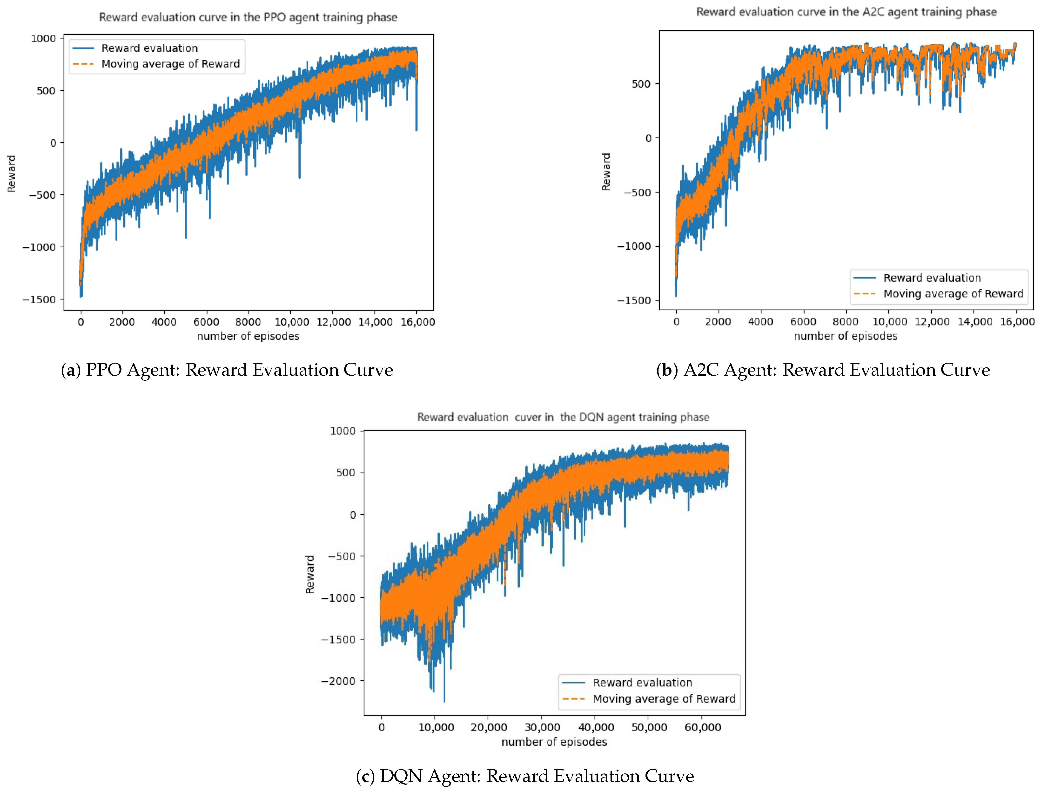 30]. A2C was chosen for its balance of computational efficiency and performance in policy gradient methods. At the same time, DQN was selected for its strong track record in handling discrete action spaces using value-based methods.